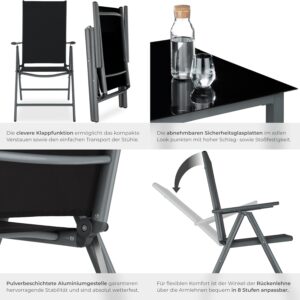 - Individueller Komfort: Die Rückenlehnen der 8 Stühle sind in 8 Stufen bis zu 135° verstellbar, was eine ergonomische Anpassung an jede Sitzposition ermöglicht.