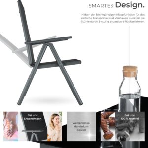 Die Gartenstühle sind klappbar und somit besonders praktisch in der Handhabung. Durch das leichte Aluminiummaterial lassen sie sich bei Nichtgebrauch einfach und platzsparend verstauen, was sie ideal für den Einsatz auf dem Balkon oder im Garten macht.