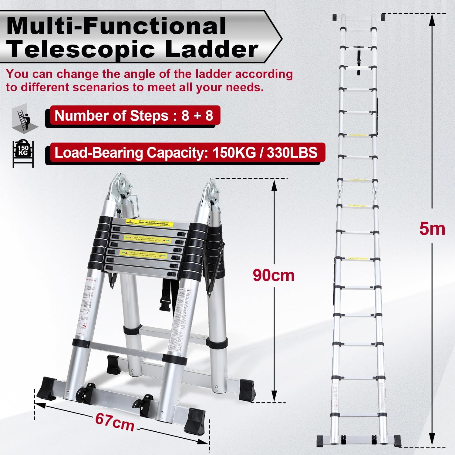 Diese Teleskopleiter ist durch ihre hochwertige Aluminiumlegierung sehr stabil und bietet bei vollständiger Ausdehnung eine maximale Tragfähigkeit von 150 kg. Zusätzliche Sicherheitsmerkmale wie gummierte, rutschfeste Stufen und stoßdämpfende Riemen sorgen für eine solide und sichere Basis bei der Arbeit.