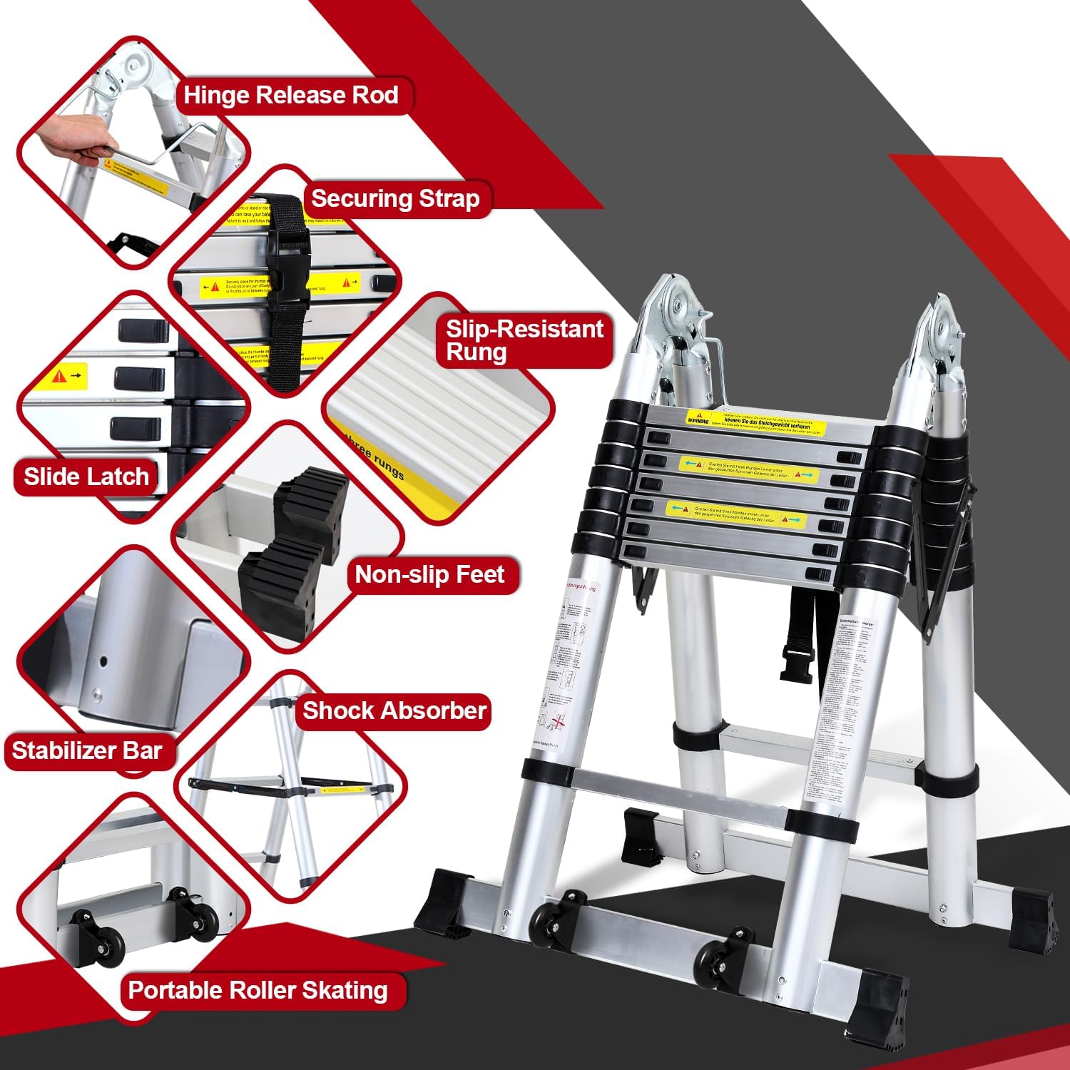 - Sicherheit an erster Stelle: Integrierte Finger-Einklemmschutz-Einstellungen verhindern Verletzungen beim Ein- und Ausfahren, während gummierte, rutschfeste Stufen für festen Halt sorgen.