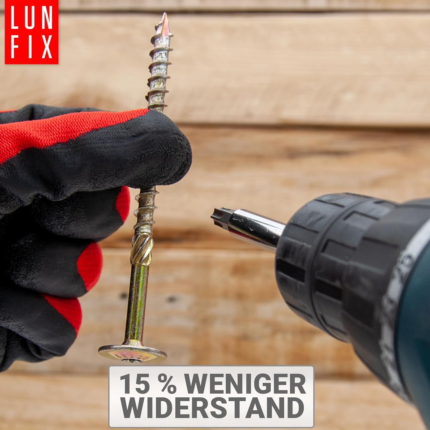 Die Tellerkopfschrauben 8×180 von Lun Fix kombinieren durchdachte Konstruktionsmerkmale für effizientes Arbeiten im Holzbau. Der Tellerkopf mit integrierten Fräsrippen fräst sich beim Eindrehen sauber in die Holzoberfläche ein und sorgt für einen flächigen Sitz ohne Materialaufwurf. Das verhindert abstehende Holzfasern und ergibt eine saubere Oberfläche – besonders wichtig bei sichtbaren Verbindungen.