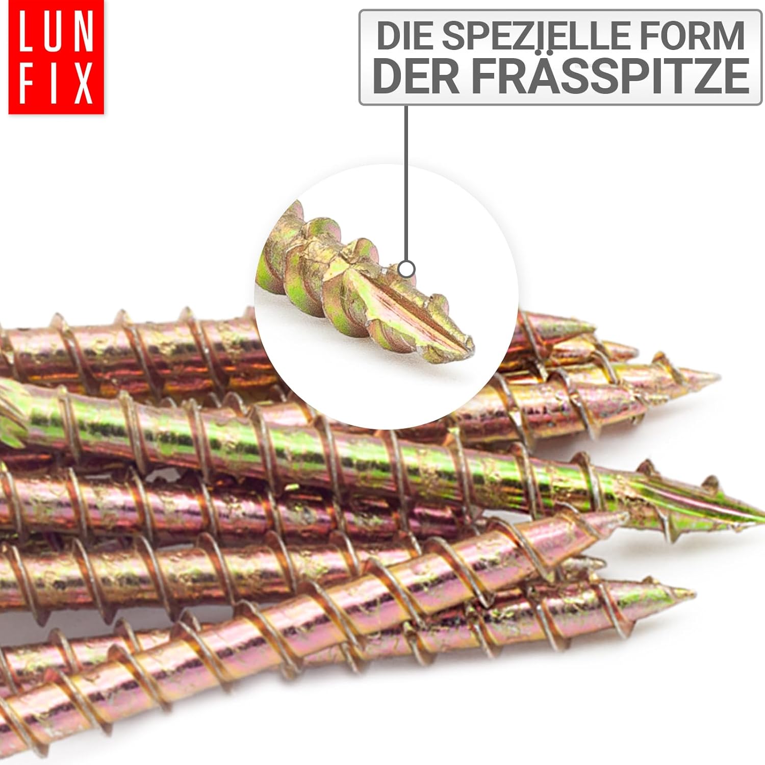 Bei diesen Tellerkopfschrauben ist kein Vorbohren notwendig, da sie über eine innovative Frässpitze mit Schneidkerben verfügen. Die präzise Spitze ermöglicht ein einfaches, selbstschneidendes Einschrauben ohne Spalten des Holzes. Das spart Zeit und macht die Montage besonders effizient für Profis und Heimwerker.