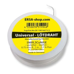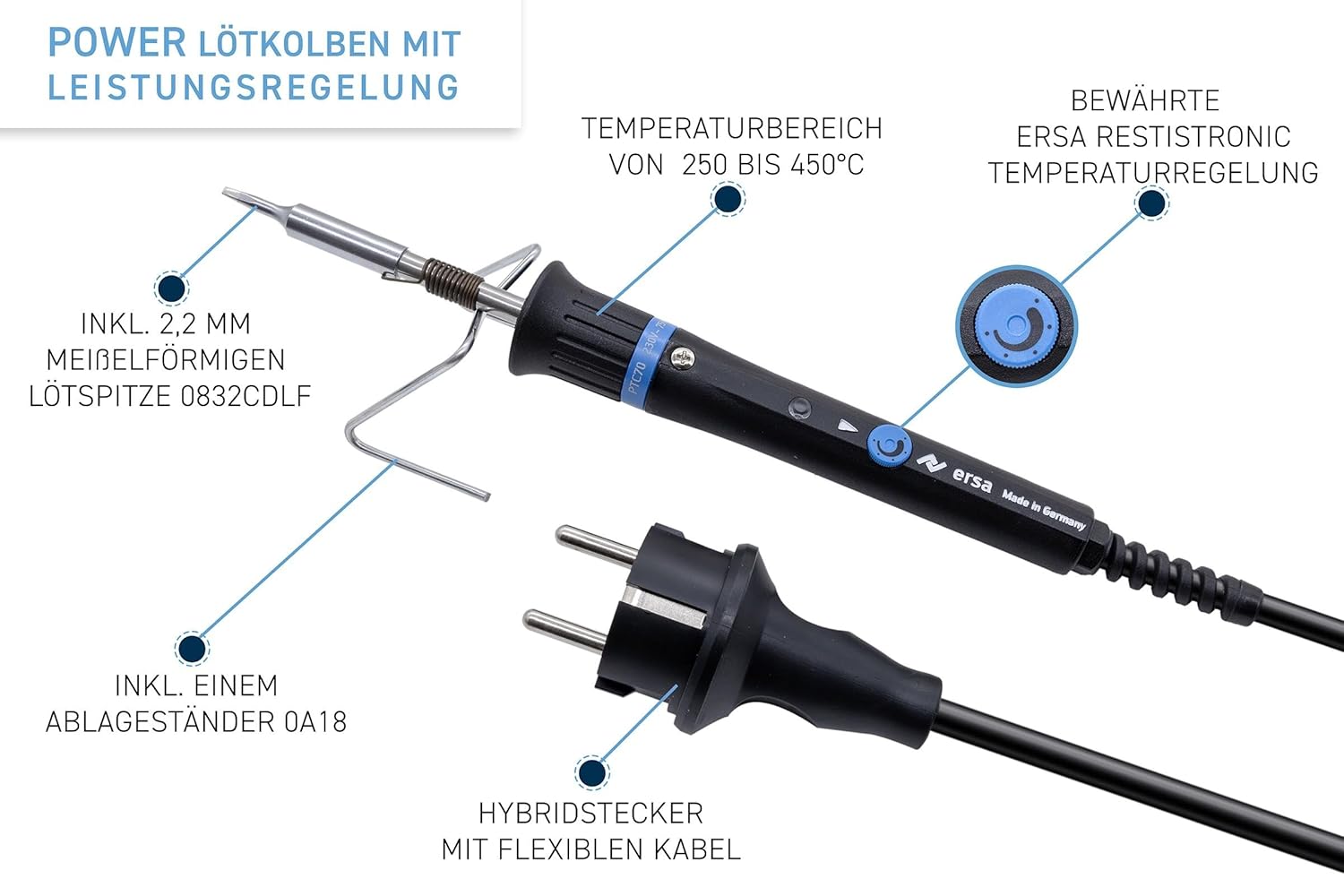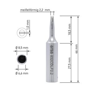 • Lieferumfang: Lötkolben PTC70 (0710CD) mit einer 2,2 mm meißelförmigen Lötspitze (0832CDLLF), ein Ablageständer (0A18) und 1m Lötdraht 0,7mm (FCL070010Ni+)