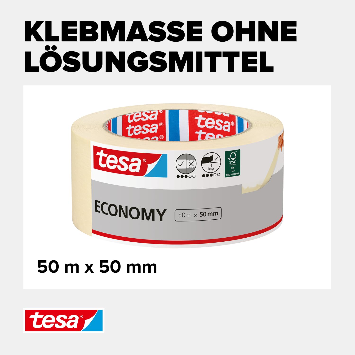 tesa Malerband ECONOMY - Vielseitiges Klebeband für Malerarbeiten ohne Lösungsmittel - Bis zu 4 Tage nach Gebrauch rückstandslos entfernbar, 50 m x 50 mm tesa Malerband ECONOMY - Vielseitiges Klebeband für Malerarbeiten ohne Lösungsmittel - Bis zu 4 Tage nach Gebrauch rückstandslos entfernbar, 50 m x 50 mm
