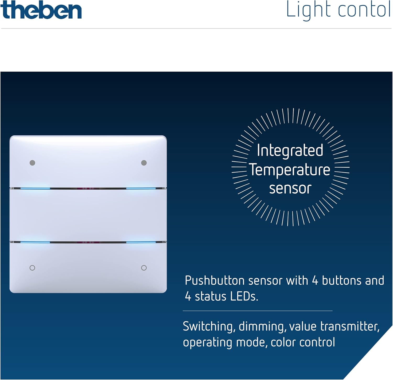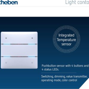 Der Tastsensor ermöglicht die komfortable Steuerung über 4 Tasten und verfügt zudem über 4 integrierte Status-LEDs. Zusätzlich ist ein Temperatursensor verbaut, der eine präzise Erfassung der Raumtemperatur direkt am Taster ermöglicht.