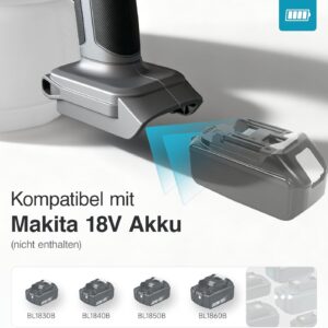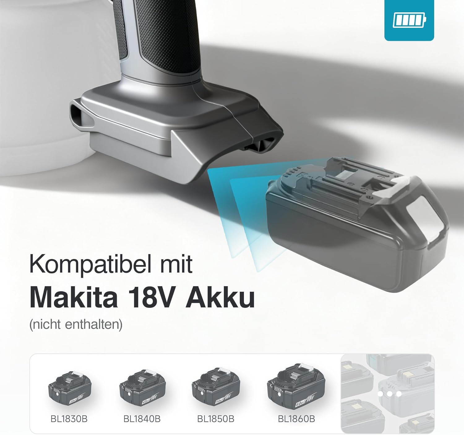 - Makita 18V Akku-Kompatibilität: Spare Anschaffungskosten, indem du vorhandene Akkus nutzt – ideal für volle Mobilität auf der Baustelle oder in der Werkstatt.