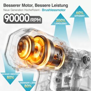 - Bürstenloser Hochleistungsmotor (90.000 RPM): Garantiert einen konstanten Farbausstoß mit minimaler Vibrationsentwicklung, was die Lebensdauer des Geräts signifikant verlängert.