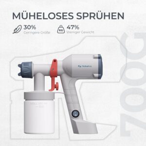 Das Tilswall Farbsprühsystem setzt neue Maßstäbe in Sachen Ergonomie und Komfort. Das Gehäuse wurde unter Verwendung spezieller Leichtbaumaterialien entwickelt, die das Gerät im Vergleich zu handelsüblichen Sprühpistolen massiv erleichtern. Dies ist besonders bei Projekten relevant, die etwas mehr Zeit in Anspruch nehmen, wie das Streichen eines gesamten Lattenzauns oder eines umfangreichen Schranksets.