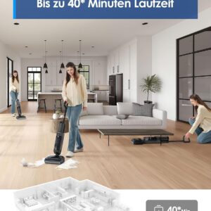 - Spart wertvolle Zeit: Saugen und Wischen in einem Arbeitsgang – bis zu 40 Minuten Laufzeit ermöglichen die Reinigung großer Wohnflächen ohne Unterbrechung