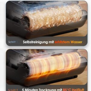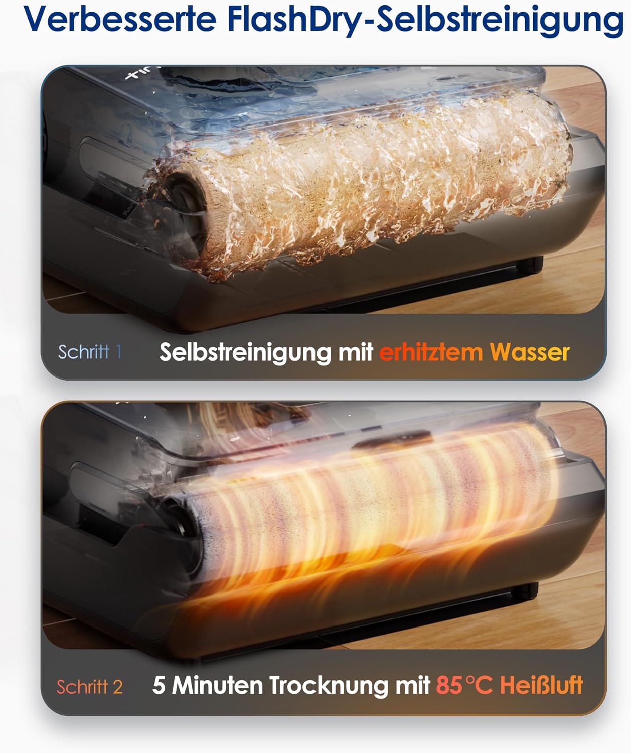 - Hygienische Selbstreinigung: Das Gerät reinigt sich per Knopfdruck selbst mit heißem Wasser und trocknet die Bürste in 5 Minuten bei 85°C – keine übelriechenden, nassen Bürsten mehr