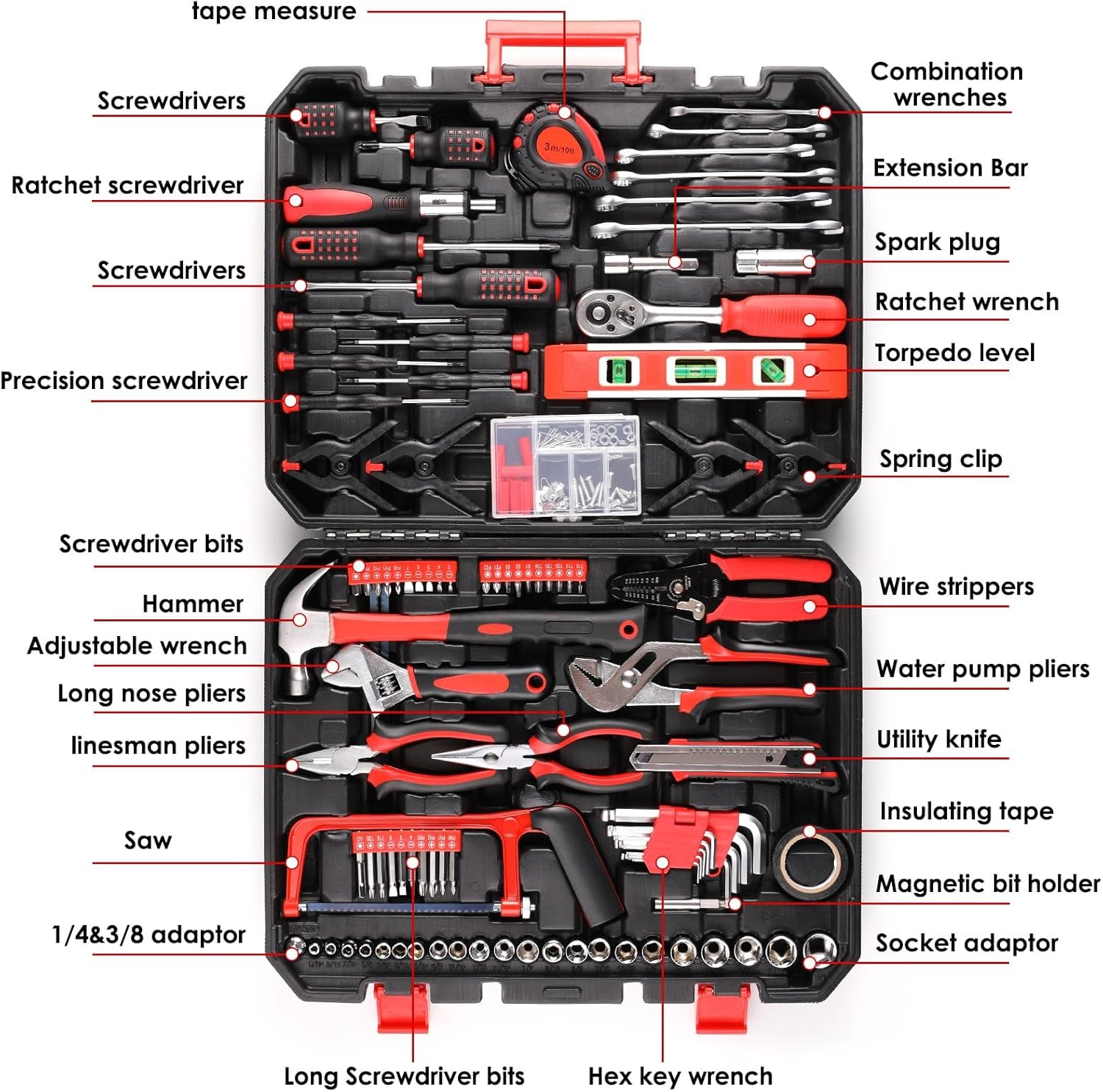 Mit 198 Teilen ist der Koffer ordentlich bestückt – vom Klauenhammer über diverse Ratschenschlüssel bis hin zu allen gängigen Schraubendrehern und Bits ist alles drin, was man für den Alltag braucht. Besonders praktisch finde ich die Kombination aus Wasserwaage, Maßband und den vielen Kleinteilen, die einem bei kleineren Reparaturen oft fehlen. In der Praxis deckt das Set damit eigentlich alles ab, was im Haushalt oder bei der Autopflege an anfällt.