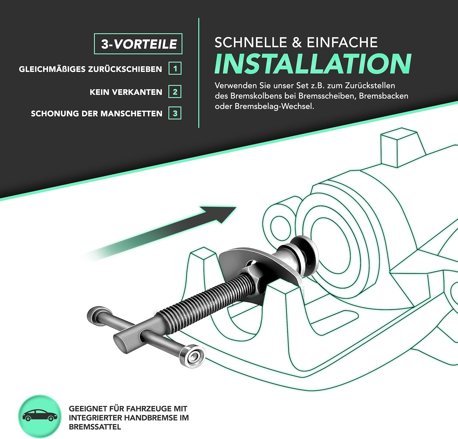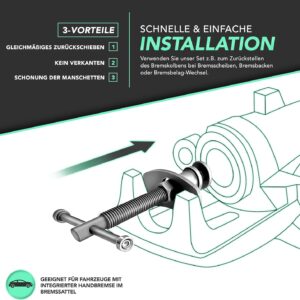 Dieses Set ist primär für Arbeiten am Bremssystem von Pkw konzipiert. Besonders bei modernen Fahrzeugen mit integrierter Handbremsfunktion im Bremssattel ist ein einfaches Zurückdrücken mit dem Schraubendreher unmöglich; hier ist ein drehendes Zurückstellen zwingend erforderlich.