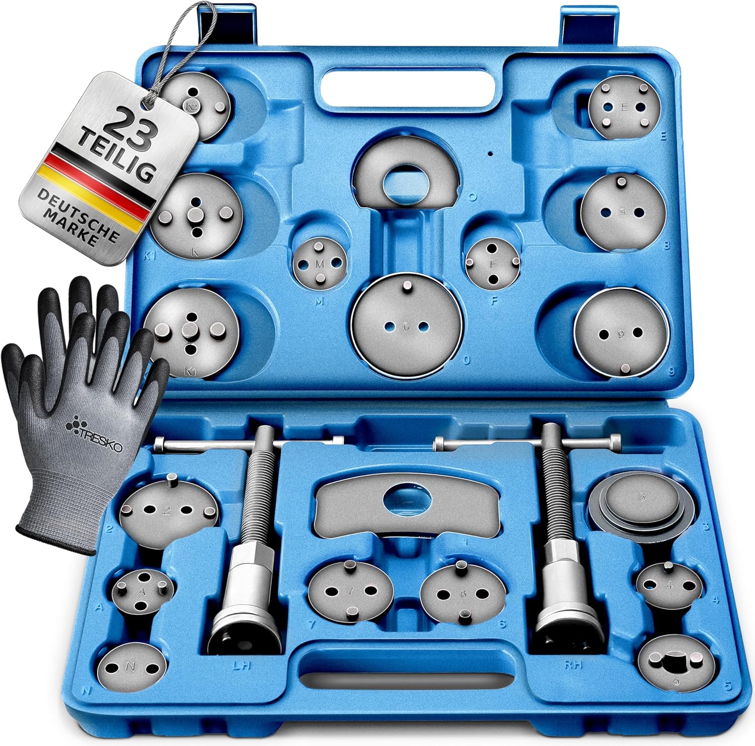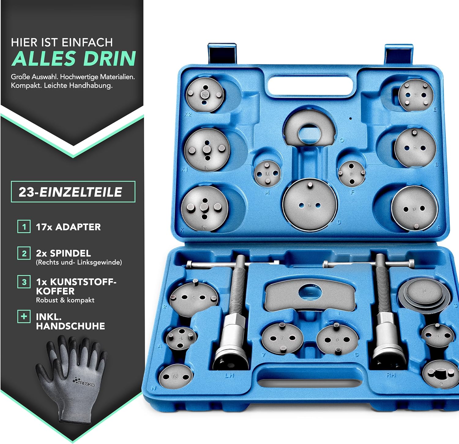 Das TRESKO 23 TLG Bremskolbenrücksteller Set ist ein umfassendes Werkzeug-Sortiment, das speziell auf die Anforderungen moderner Bremssysteme zugeschnitten ist. Das Set besteht aus zwei Spindeleinheiten (Rechts- und Linksgewinde) und 17 fahrzeugspezifischen Adaptern, die ein gleichmäßiges Zurückschieben des Kolbens in den Bremssattel ermöglichen. Konstruktionsbedingt ist es gerade bei Fahrzeugen mit elektrischer oder mechanischer Parkbremse notwendig, den Kolben unter Rotation rückzustellen – dies minimiert das Risiko von Beschädigungen an der Mechanik.