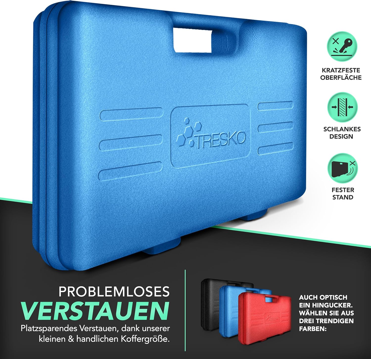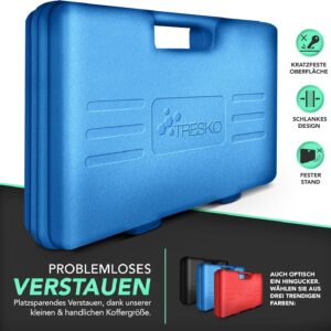 | Material | Gehärteter Stahl, Kunststoff-Koffer |