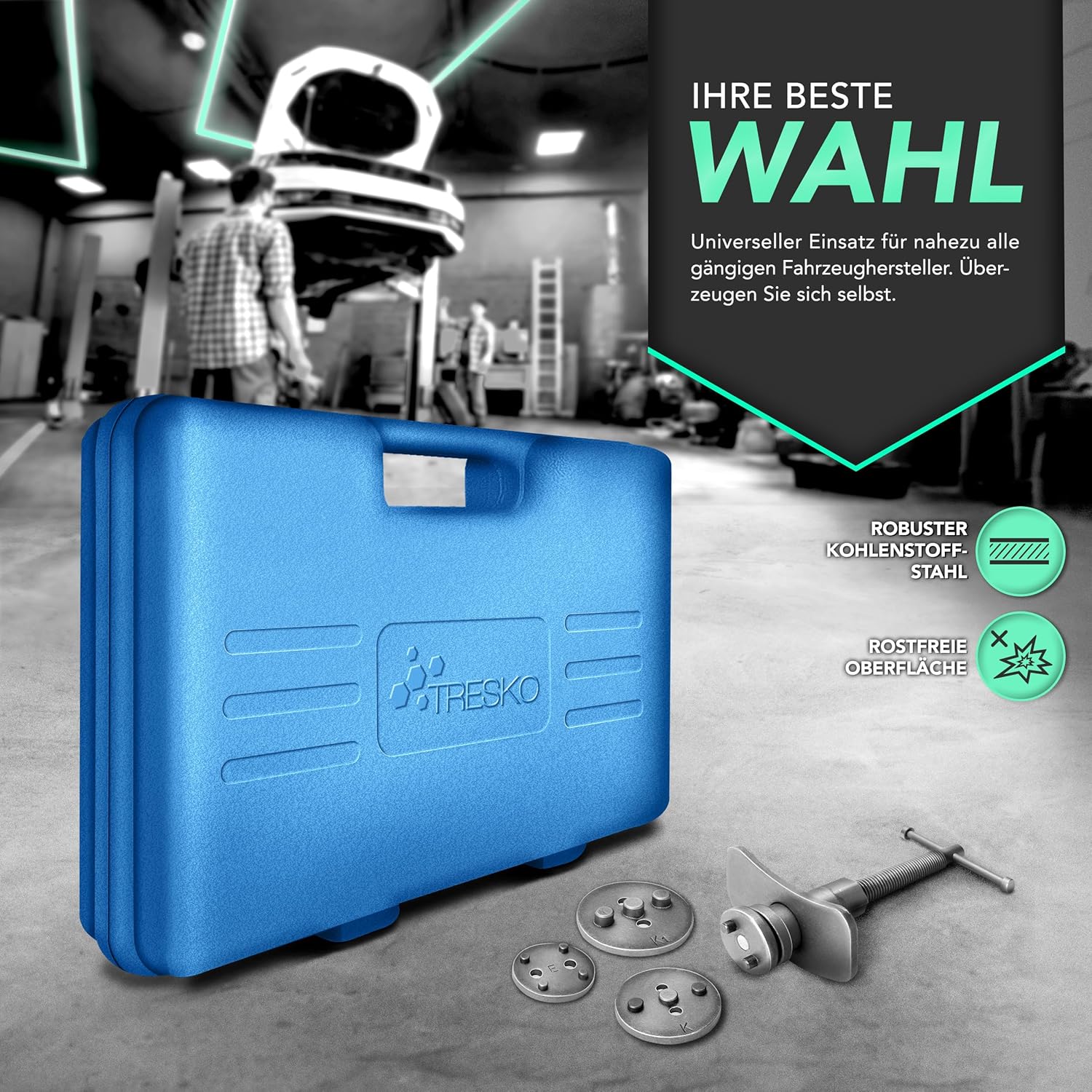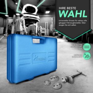 Das Werkzeug wird genutzt, um den Bremskolben gleichmäßig und ohne Verkanten zurückzuschieben, was besonders bei Fahrzeugen mit integrierter Handbremse im Bremssattel notwendig ist. Im Set von TRESKO sind hierfür Spindeln mit Rechts- und Linksgewinde sowie 17 verschiedene Adapter enthalten, die mit wenig Kraftaufwand eine Beschädigung der Manschetten verhindern.