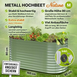 Das Metall-Hochbeet aus der „NATURE“ Serie verfügt über großzügige Außenmaße von 160 x 80 x 80 cm. Dank dieser sogenannten Full-Size-Höhe von 80 cm ist es ideal für einen ergonomischen, rückenschonenden Gärtneralltag geeignet.