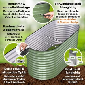 Das TTL GARDEN 160x80x80cm Nature M Metall Hochbeet kombiniert Funktionalität mit einem modernen Designansatz. Die Konstruktion aus 0,6 mm starkem Wellblech ist eine bewusste Entscheidung für Stabilität. Im Vergleich zu Holzbeeten, die durch Feuchtigkeit mit den Jahren morsch werden können, bietet dieses Metallbeet eine wartungsfreie Alternative. Die salbei-grüne Beschichtung fügt sich unauffällig in das natürliche Gartenbild ein.