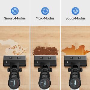 - Intelligente Schmutz-Erkennung: Das Gerät passt Saugkraft und Wassermenge automatisch an – bei Tierhaaren wird mehr Power aktiviert, auf leicht verschmutzten Flächen wird Energie gespart