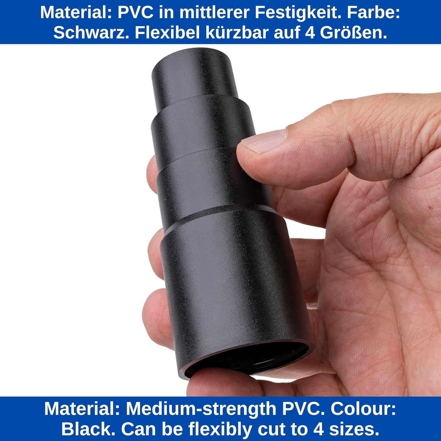 Aus unserer Erfahrung in der Werkstatt ist die Flexibilität des Materials der entscheidende Punkt. Da der Adapter aus PVC gefertigt ist, lässt er sich mit einem scharfen Messer auf die exakte Stufe kürzen, die du für dein Gerät benötigst. Unser Team hat getestet, wie sich der Adapter bei hartnäckigen Verbindungen verhält: Sollte ein Anschluss minimal zu eng sein, hilft das vorsichtige Erwärmen des Materials mit einem Heißluftföhn. Sobald das Material geschmeidig wird, lässt es sich über den Anschluss stülpen und schließt nach dem Abkühlen nahezu luftdicht ab.