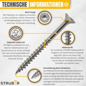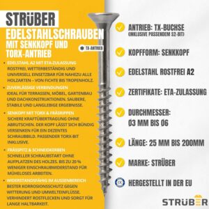 - • Rostfreier Edelstahl A2 verhindert Verfärbungen auf Terrassenhölzern wie Teak, Cumaru oder Bangkirai – keine unschönen Rostflecken auch nach Jahren