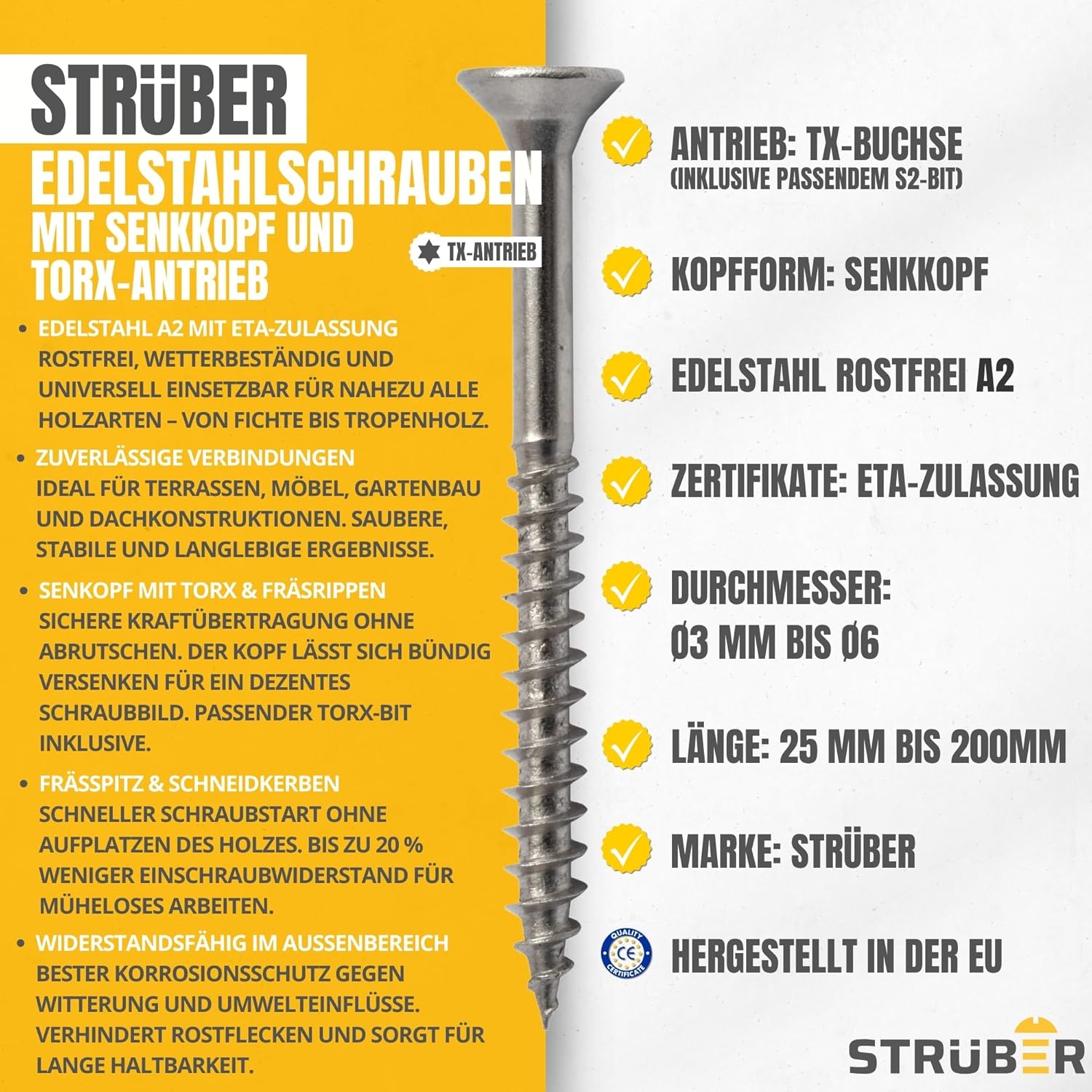 Die Universalschraube aus Edelstahl A2 wurde speziell für den Außenbereich entwickelt, wo herkömmliche verzinkte Schrauben durch Witterung und Holzinhaltsstoffe korrodieren würden. Der rostfreie Edelstahl A2 hält auch in direktem Kontakt mit feuchtem Holz, Regenwasser und UV-Strahlung stand – ohne dass sich dunkle Rostflecken bilden. Das ist besonders wichtig bei hellen Terrassenhölzern, wo Verfärbungen sofort auffallen würden.
