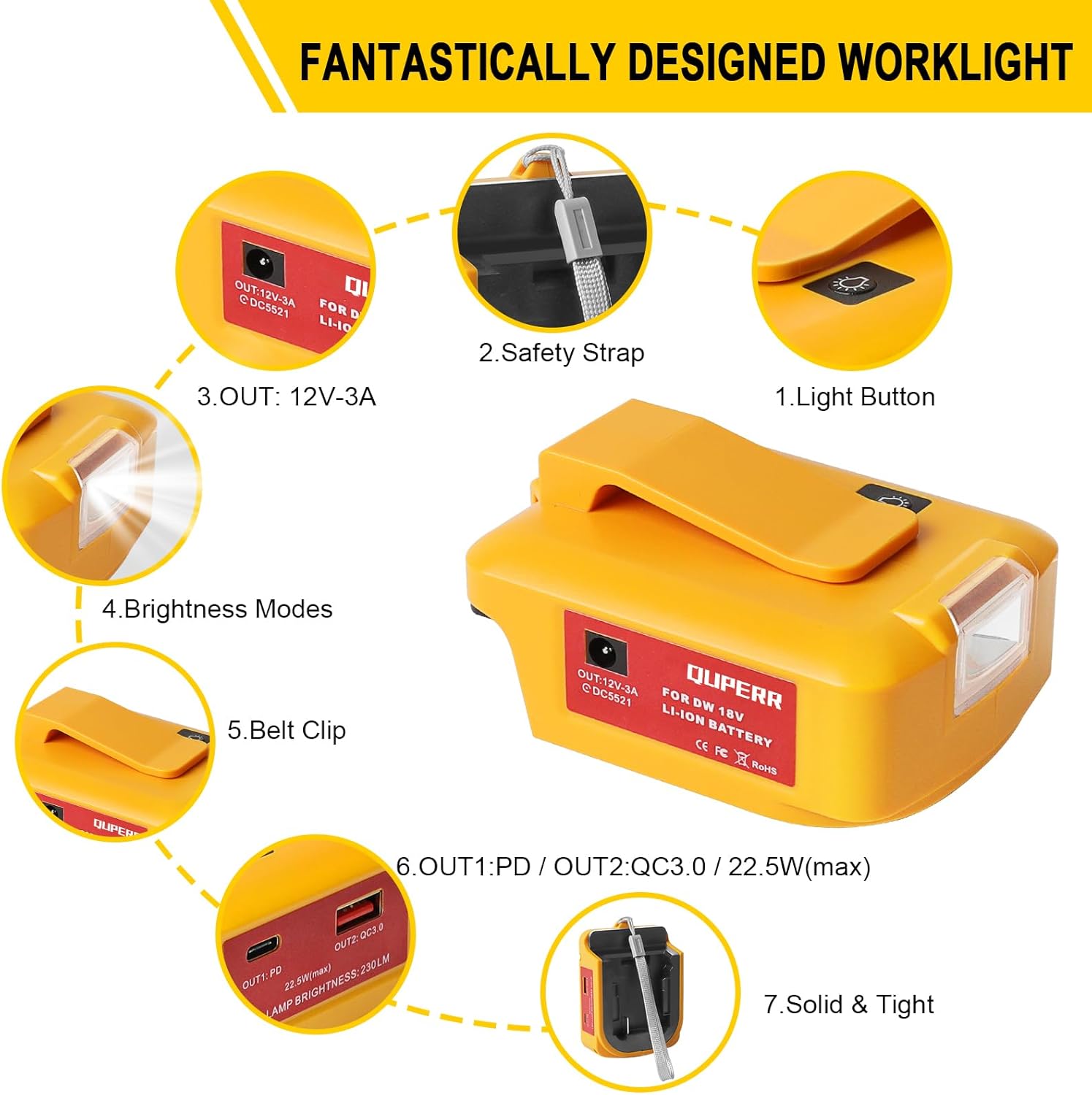 - Doppelter Nutzen: Verwandelt deinen Dewalt 18V Akku in eine Powerbank mit integrierter LED-Arbeitsleuchte – zwei Funktionen in einem Gerät