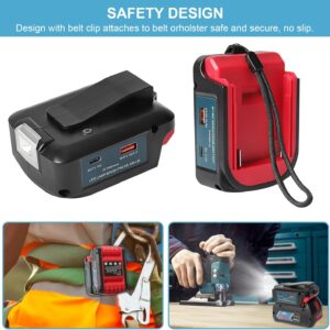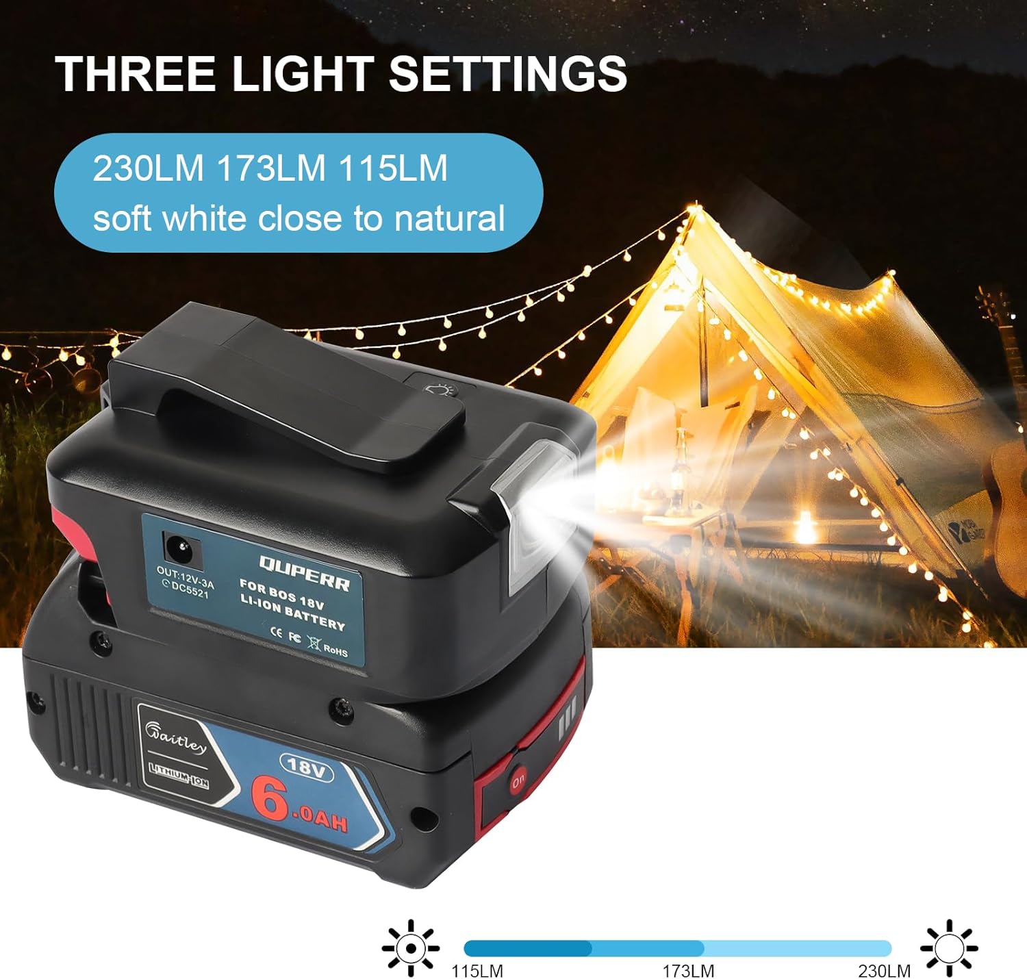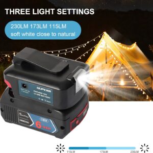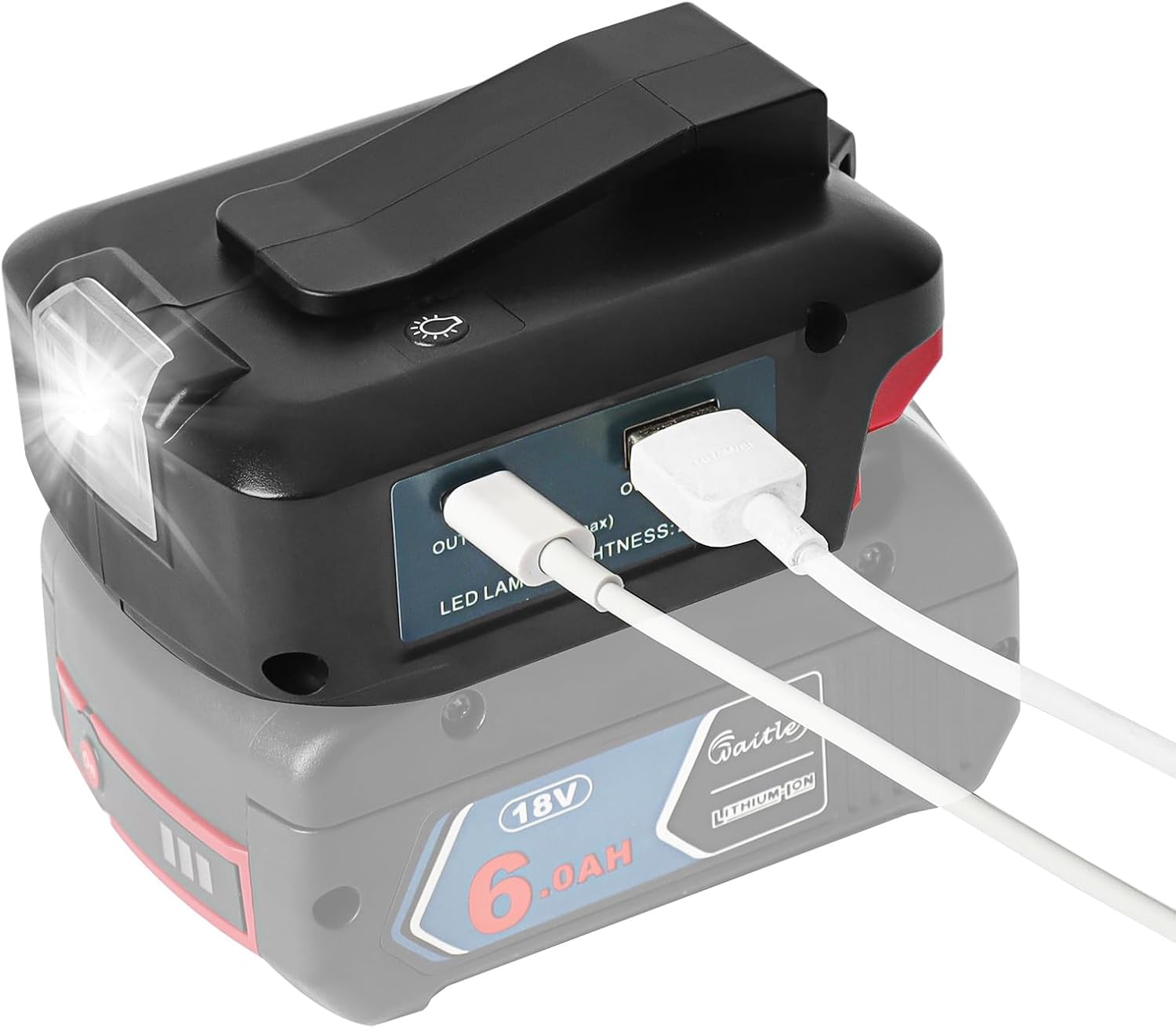 USB Ladegerät Adapter für Bosch Professional Akku 18V mit Zwei USB-Anschlüssen & DC 12V 3A Anschluss & LED-Arbeitsleuchte & Gürtelclip (Akku Nicht enthalten)