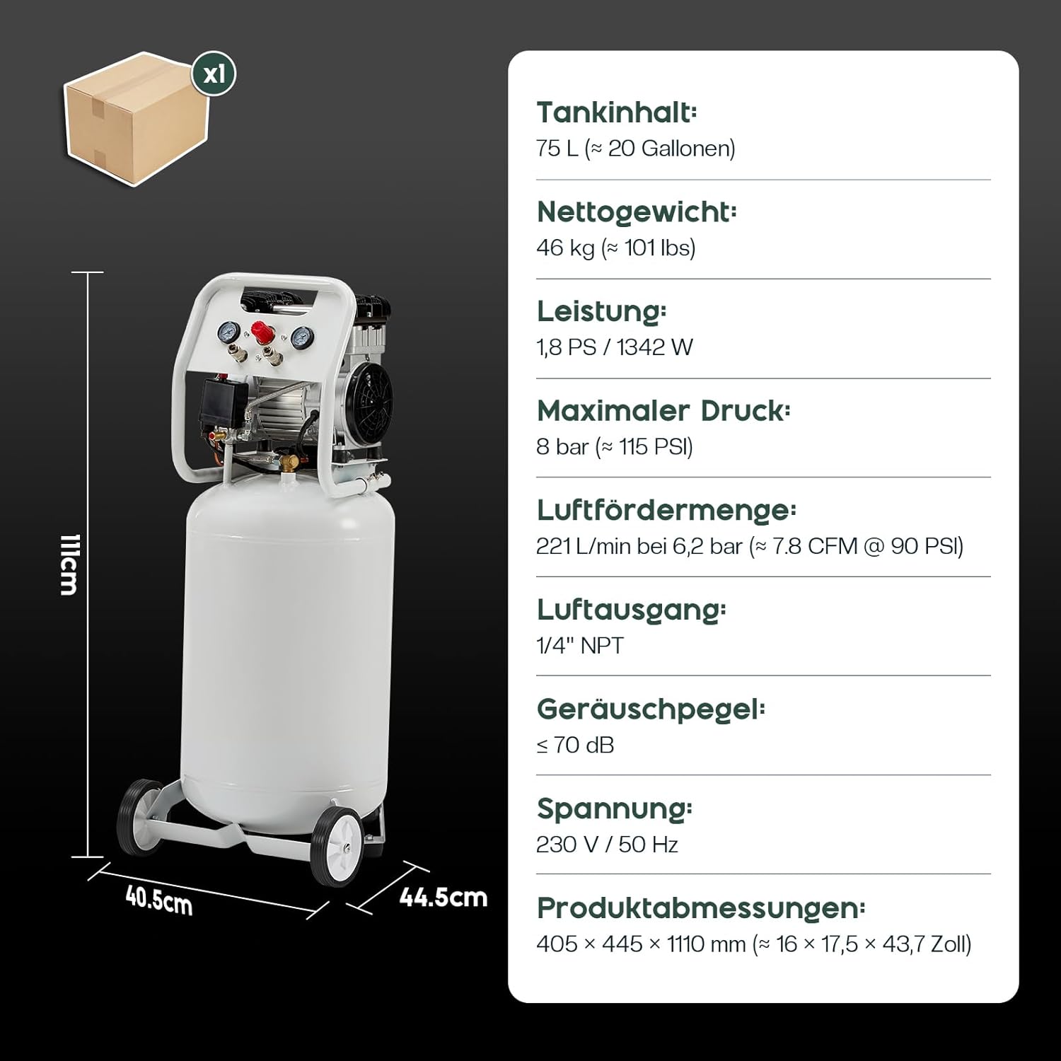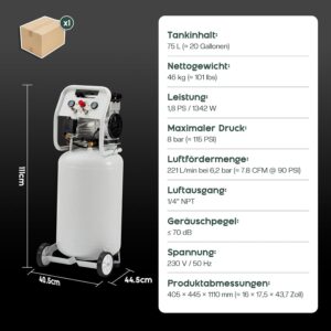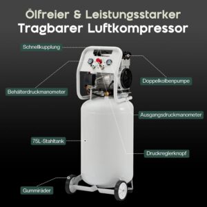 Das vertikale Design ist platzsparend und ermöglicht eine einfache Aufbewahrung auch in kleineren Werkstätten oder Garagen. Zudem ermöglicht der 75-Liter-Tank längere Laufzeiten ohne häufige Neustarts, was den Betrieb bei kontinuierlichen Arbeiten deutlich effizienter macht.