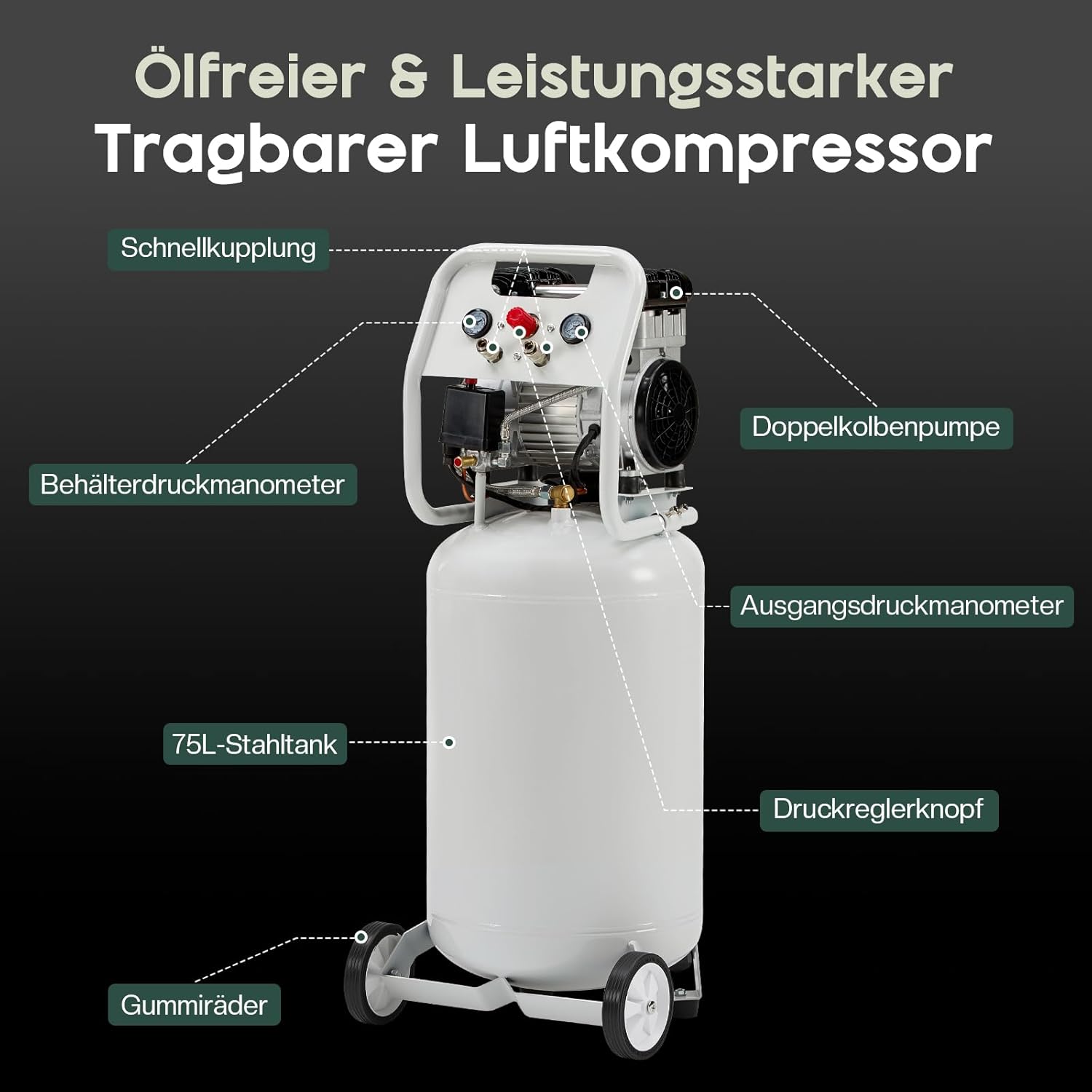 Was sind die Hauptvorteile des vertikalen Designs bei diesem 75-Liter-Kompressor?