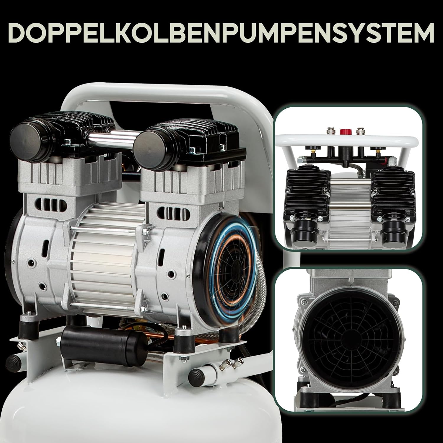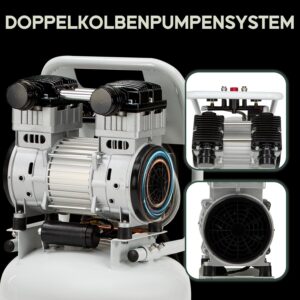 Das Gerät ist mit einem integrierten Überhitzungsschutz und zwei großen Kühlventilatoren ausgestattet, die für einen sicheren Dauerbetrieb sorgen. Zur präzisen Überwachung des Luftdrucks verfügt der Kompressor zudem über zwei leicht ablesbare Druckanzeigen.