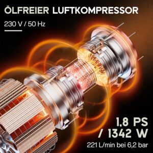 - • Ölfreier Betrieb: Eliminiert den Ölwechsel und verhindert Ölrückstände in der Druckluft, was besonders beim Lackieren oder Ausblasen elektronischer Bauteile entscheidend ist.
