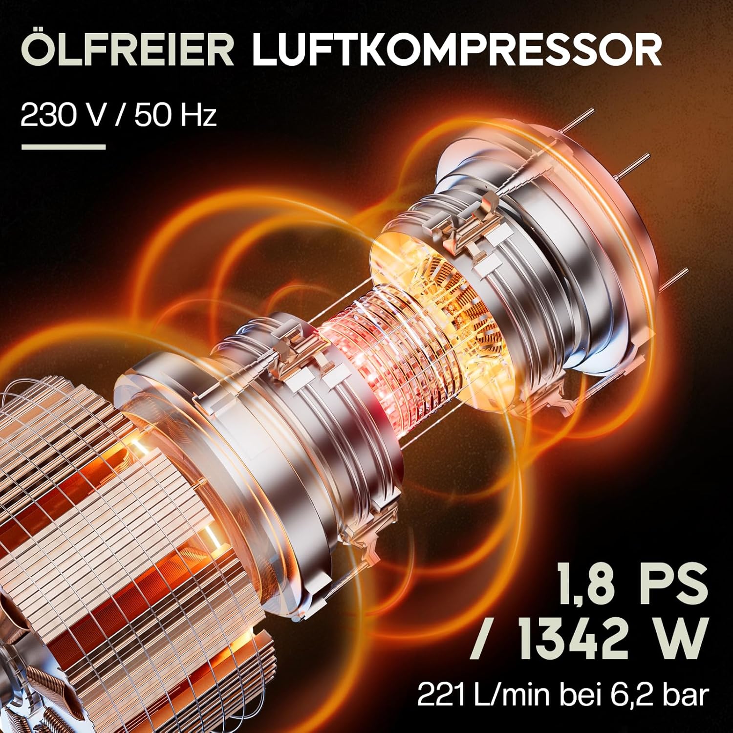 Mit einer Leistung von 1,8 PS (1340 W) und einem Maximaldruck von 120 PSI (ca. 8 Bar) eignet sich der Kompressor ideal für vielfältige Standard-Druckluftarbeiten in der Werkstatt. Sein hochwertiger Kupfermotor sorgt dabei für einen schnellen und gleichmäßigen Luftstrom.