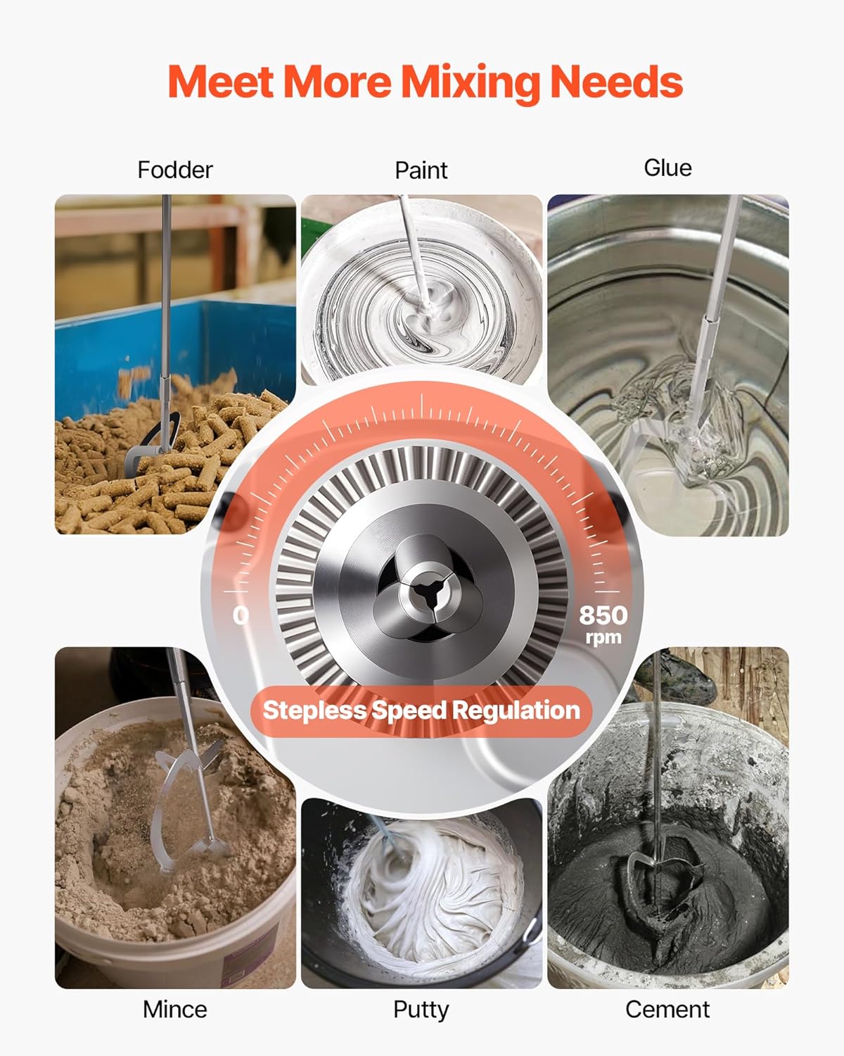 - Präzise Drehzahlregelung: Mit 0 bis 850 U/min passt du die Geschwindigkeit exakt an das Material an, um Spritzer beim Mischen oder Materialausrisse beim Bohren zu minimieren.