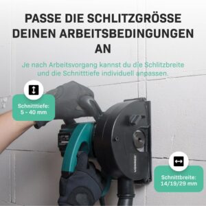 ![VONROC Schlitzfräse Mauernutfräse mit Absaugung [1700W] - Nutfräser für Kabelnut [14/19/29mm] - Schlitzmaschine 150mm mit Schnittiefe [4-40mm] inklusive 4 Diamantscheiben – Bild 4](https://werkking.de/wp-content/uploads/2026/04/71RKyo-Z56L._AC_SL1201_.jpg)
