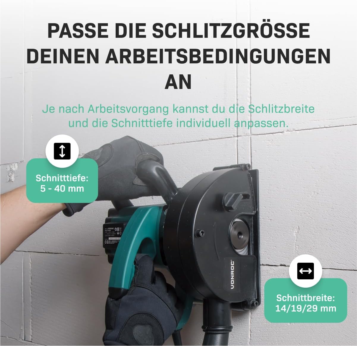 ![VONROC Schlitzfräse Mauernutfräse mit Absaugung [1700W] - Nutfräser für Kabelnut [14/19/29mm] - Schlitzmaschine 150mm mit Schnittiefe [4-40mm] inklusive 4 Diamantscheiben – Bild 5](https://werkking.de/wp-content/uploads/2026/04/61fDEHfqL5L._AC_SL1201_.jpg)