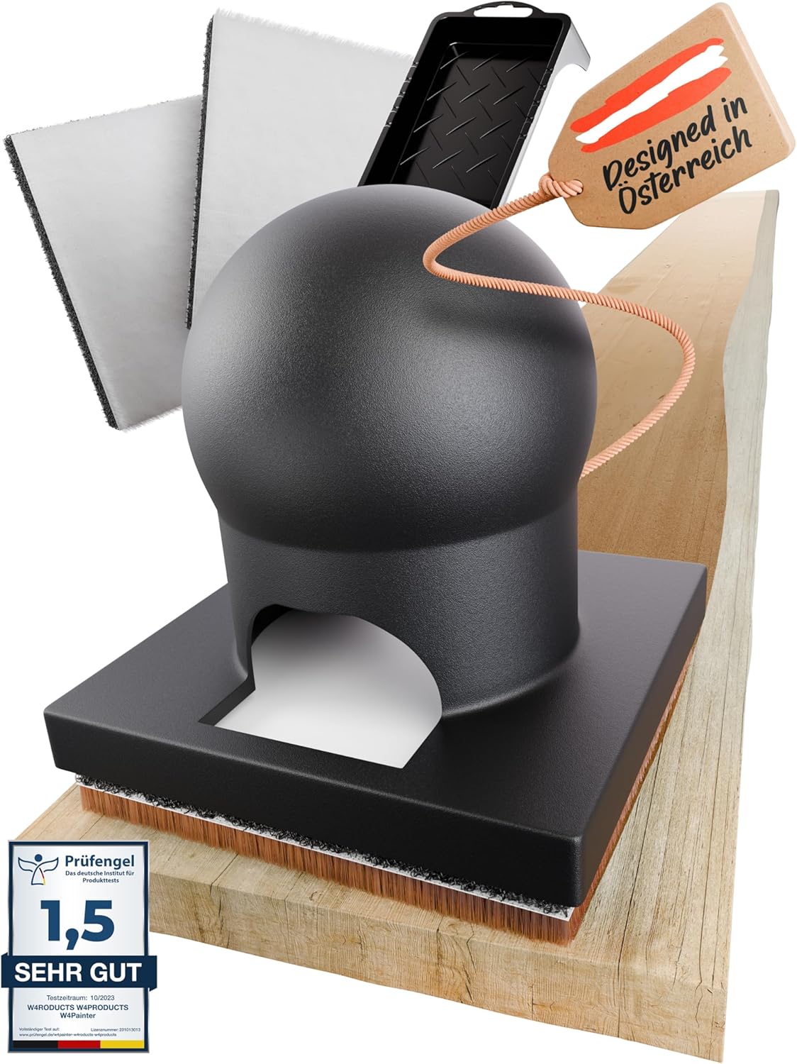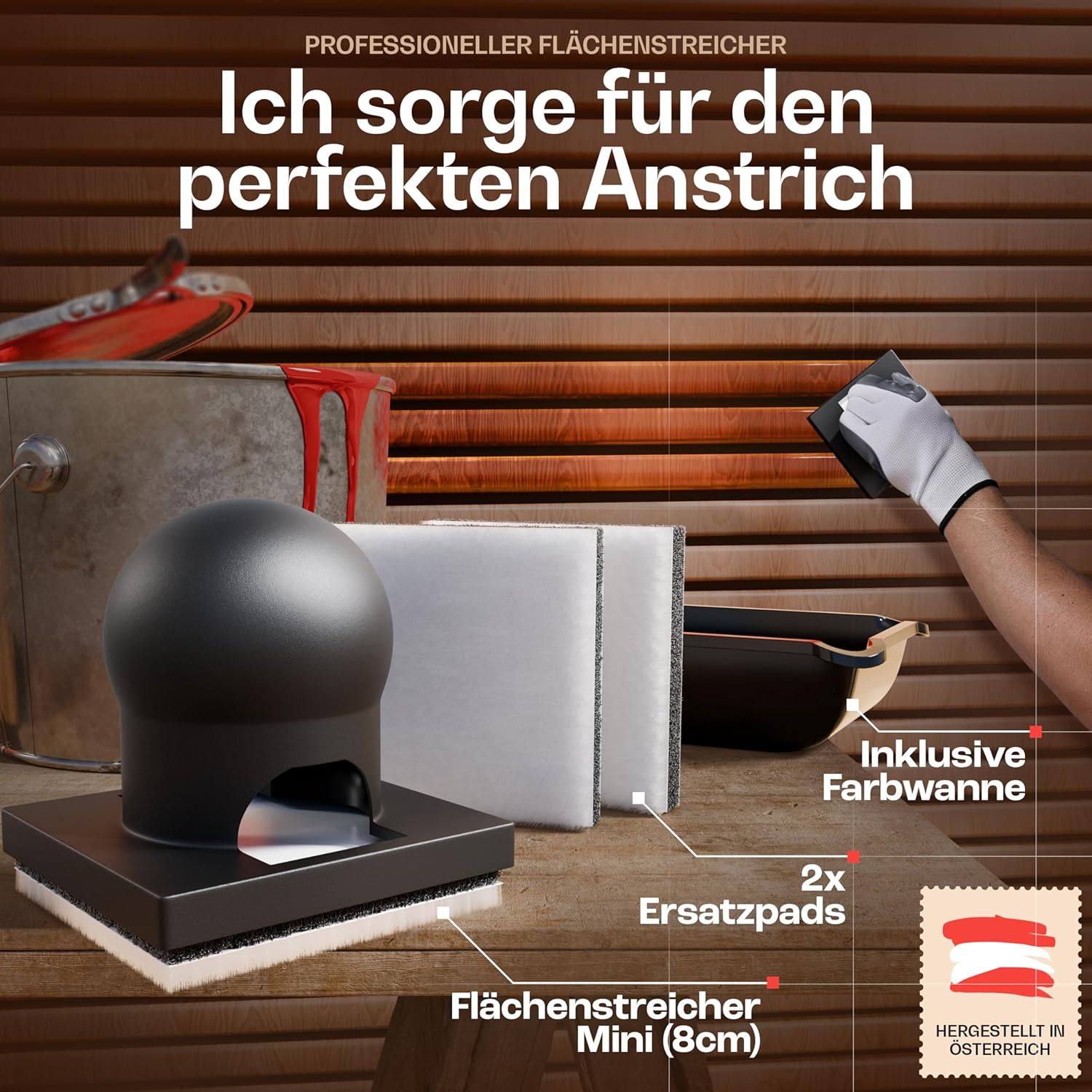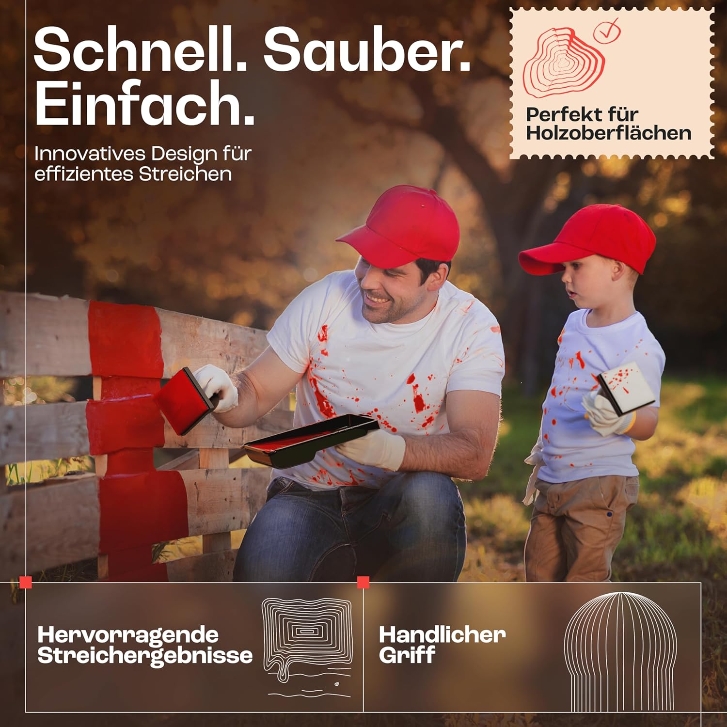 Ja, dank des ergonomischen Designs und der effizienten Austausch-Pads ist das Set ideal für die Bearbeitung von Holzoberflächen geeignet. Die enthaltene Farbwanne sorgt zudem für einen sauberen und unkomplizierten Arbeitsablauf bei größeren Projekten.