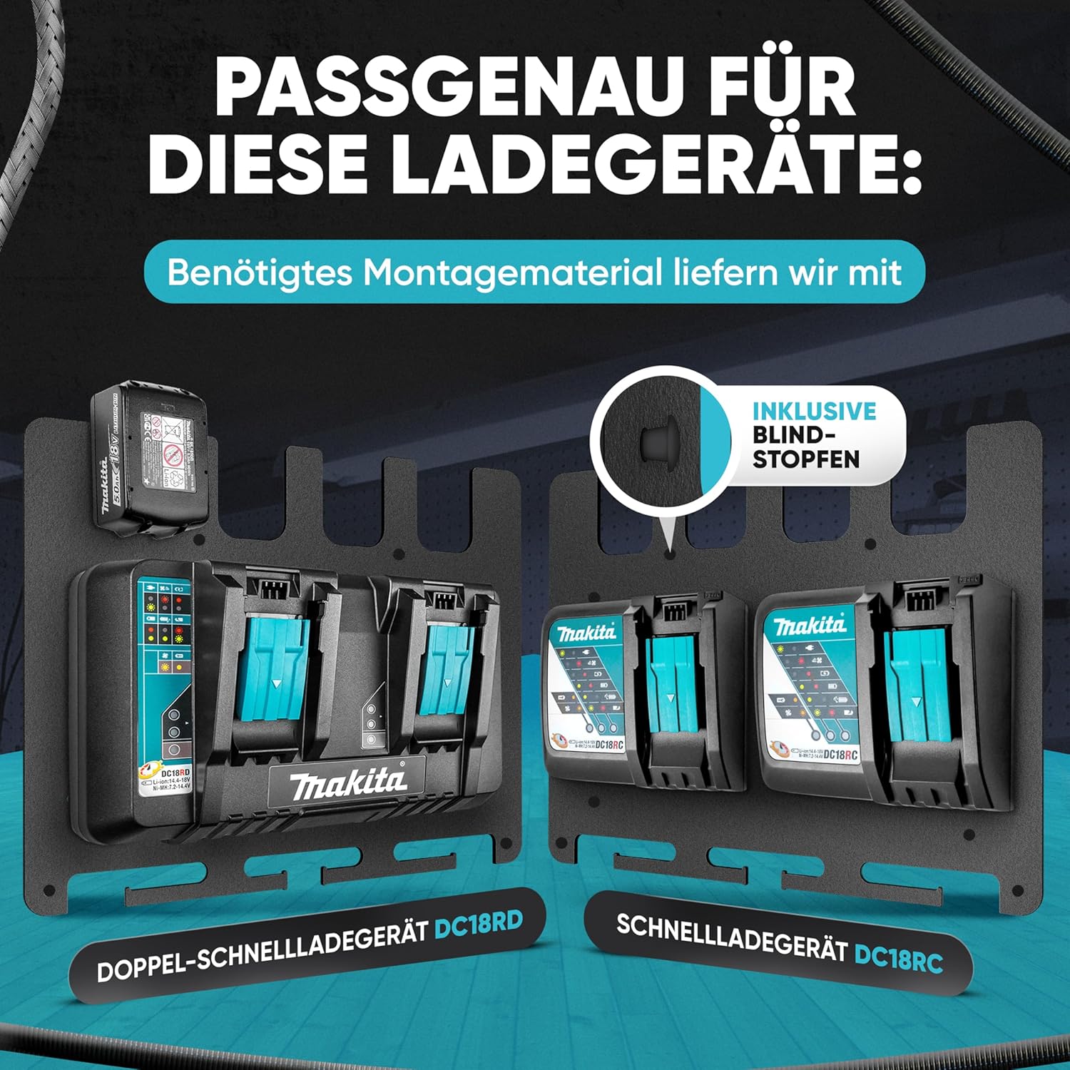 Viele Leute unterschätzen den Komfort, wenn auch das Ladegerät fest an seinem Platz sitzt. Diese Halter sind speziell auf das Makita-System ausgelegt, was in der täglichen Anwendung deutlich stabiler wirkt als irgendeine Bastellösung. Wenn alles einen festen Platz hat, wirkt die Werkstatt sofort professioneller und aufgeräumter.