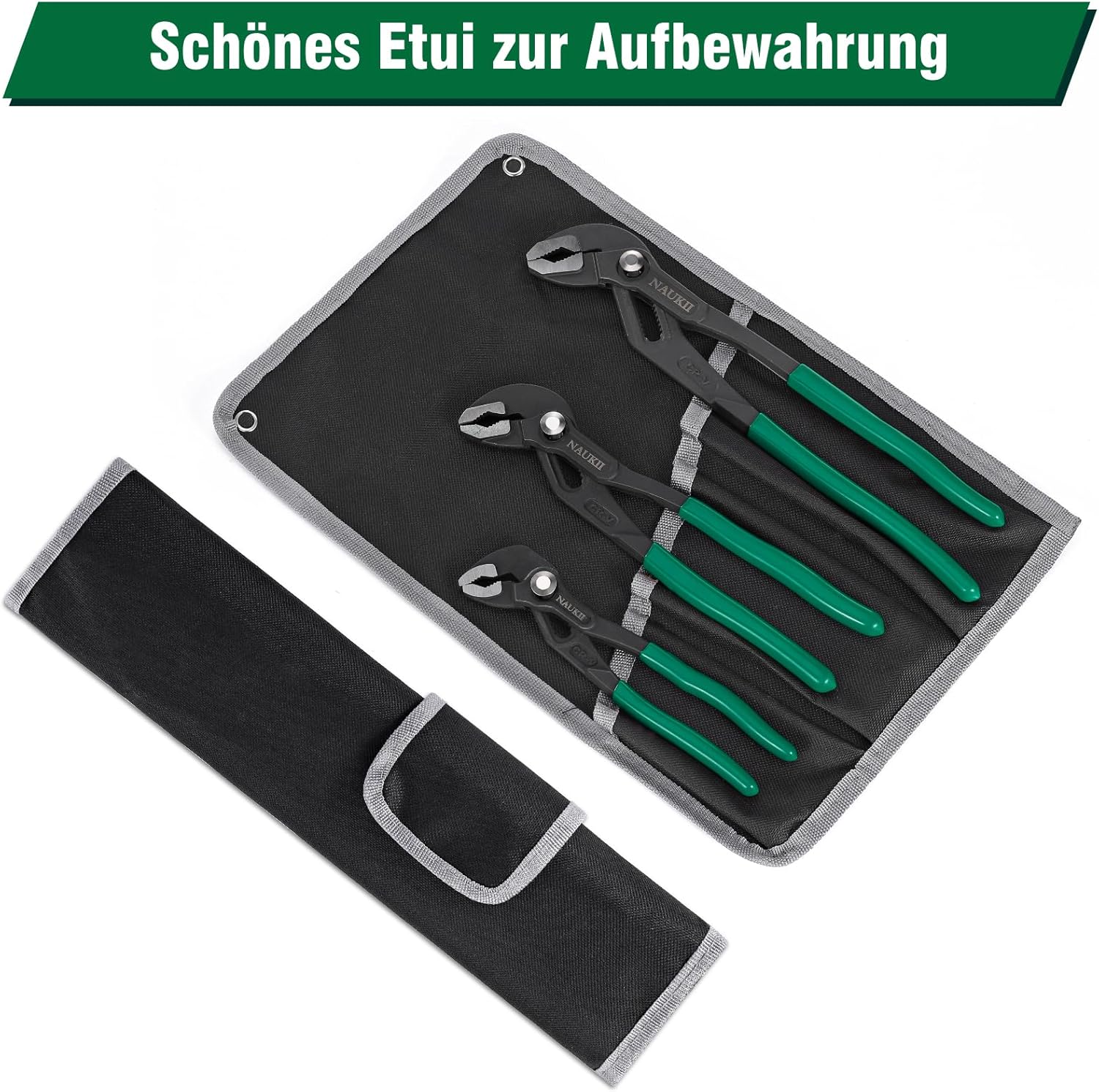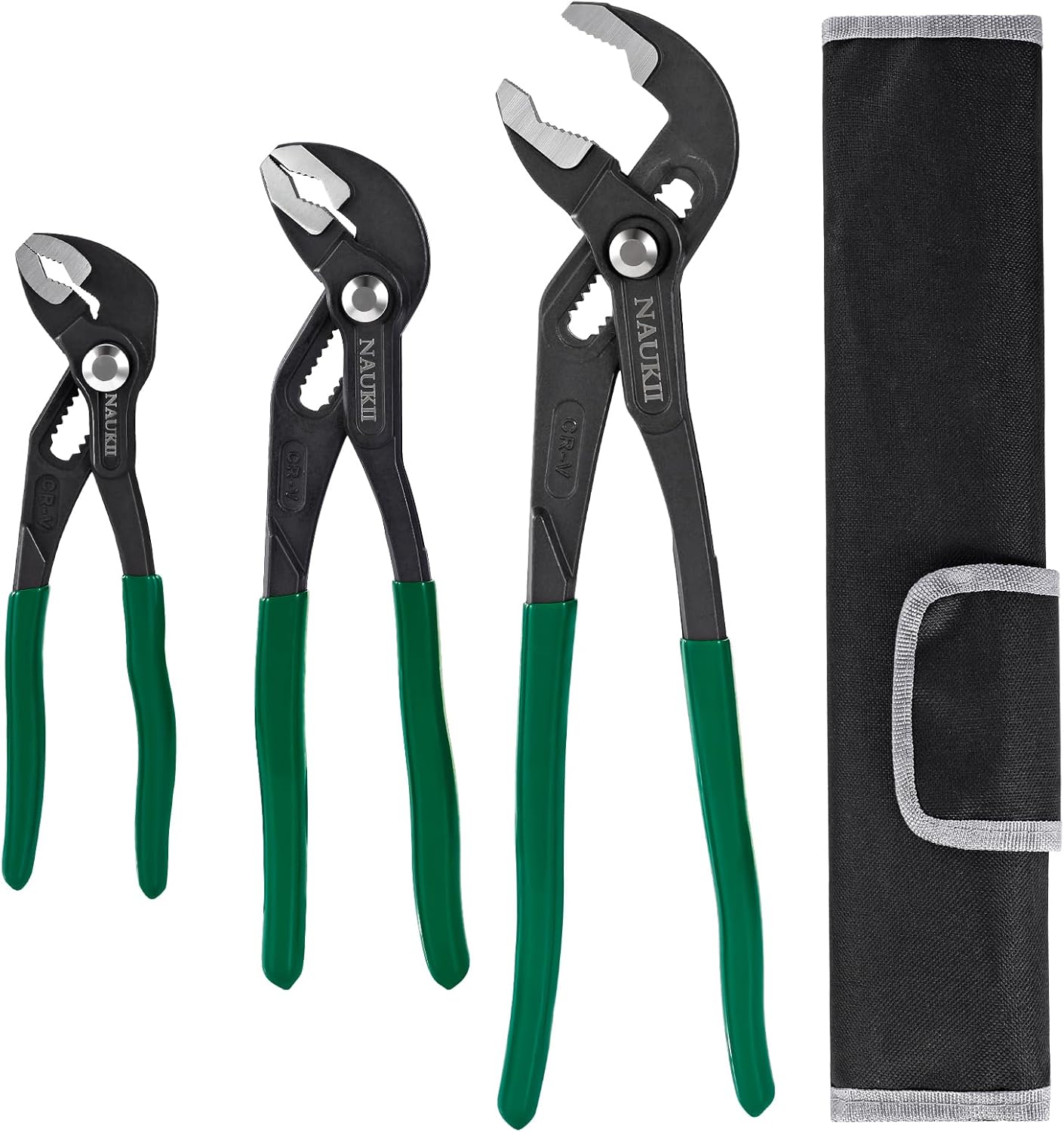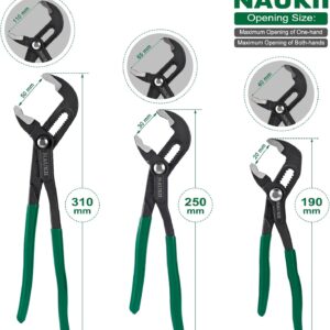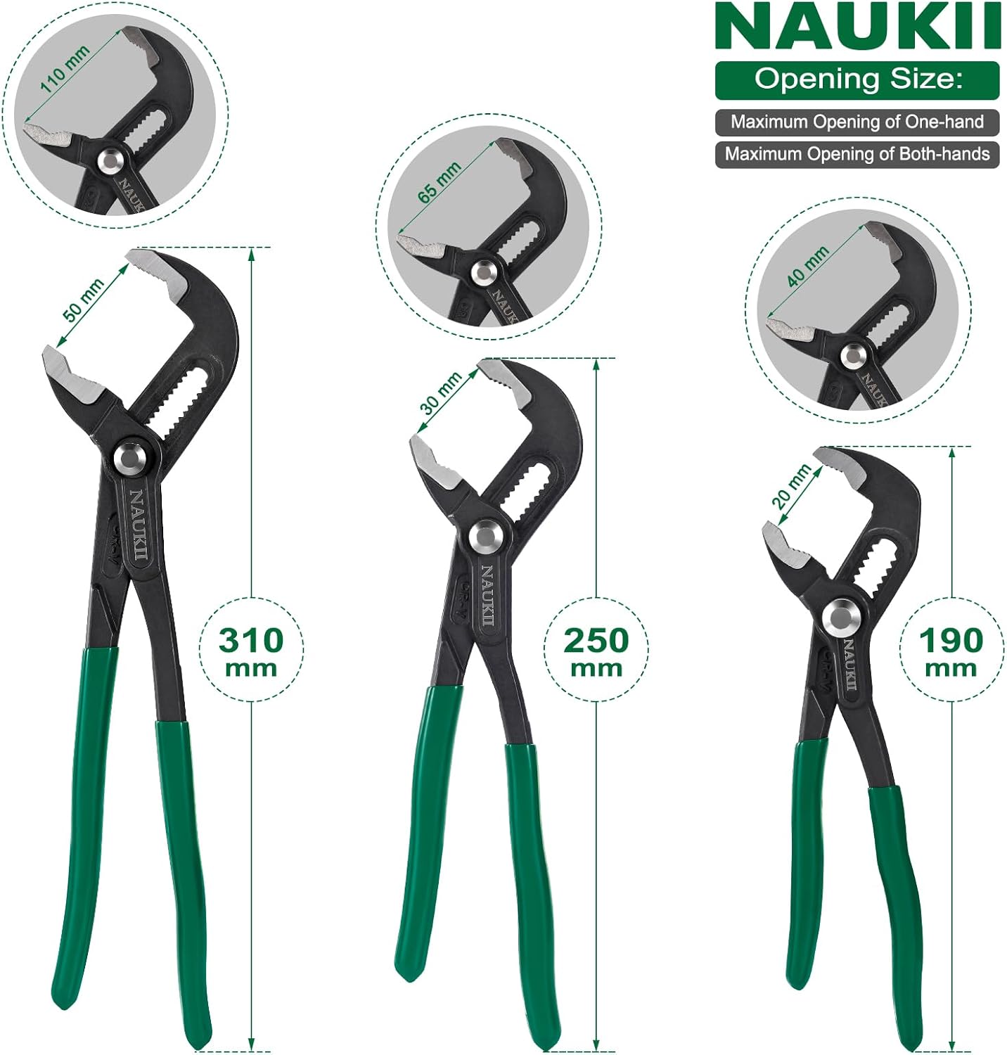 • 3-teiliges Zangenset, jeweils 7 Zoll, 10 Zoll und 12 Zoll. Die 7-Zoll-Zange hat eine Einhandöffnung von 20 mm (0,7 Zoll) und eine maximale Öffnung von 40 mm (1,57 Zoll); die 10-Zoll-Zange hat eine Einhandöffnung von 30 mm (1,18 Zoll) und eine maximale Öffnung von 65 mm (2,56 Zoll); die 12-Zoll-Zange hat eine Einhandöffnung von 50 mm (1,97 Zoll) und eine maximale Öffnung von 110 mm (4,33 Zoll). Weitere Details entnehmen Sie bitte dem Referenzbild zur besseren Veranschaulichung.