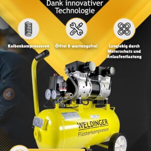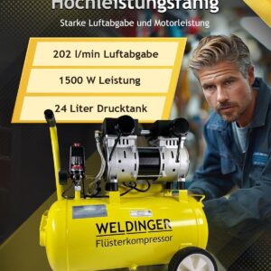 1071 Rezensionen für WELDINGER Flüsterkompressor FK 120 turbo pro 1500 W Luftabgabe 202 l/min ölfrei innenbeschichteter 24 l Tank Druckregler 5 Jahre Garantie