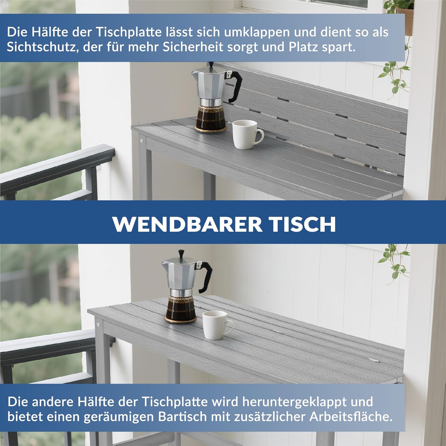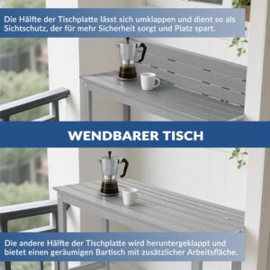 Das ist eine durchdachte Lösung: Der 20 cm hohe Rand verhindert, dass Getränke oder Kleinkram bei Wind direkt runterhüpfen. Was viele unterschätzen, ist die Flexibilität: Klappst du den Schutz nach unten, hast du im Handumdrehen eine größere Tischfläche von 120 x 33 cm. Ein Trick aus der Praxis für kleine Terrassen – so hast du morgens beim Kaffee den Schutzrand und abends bei der Grillfeier die volle Stellfläche ohne störende Kanten.