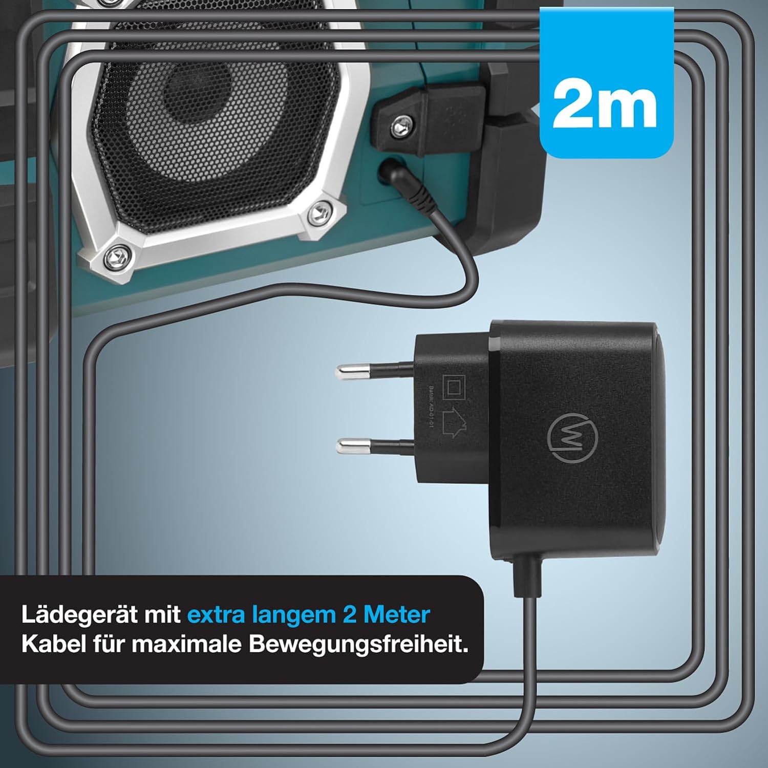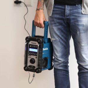 • Funkentstört: 100% geeignet für Makita Baustellen Radios der Serien DMR und BRM bis Bauhreihe 112 oder darunter. Kompaktes Ladegerät für rauschfreien Empfang über DAB+, FM und Bluetooth