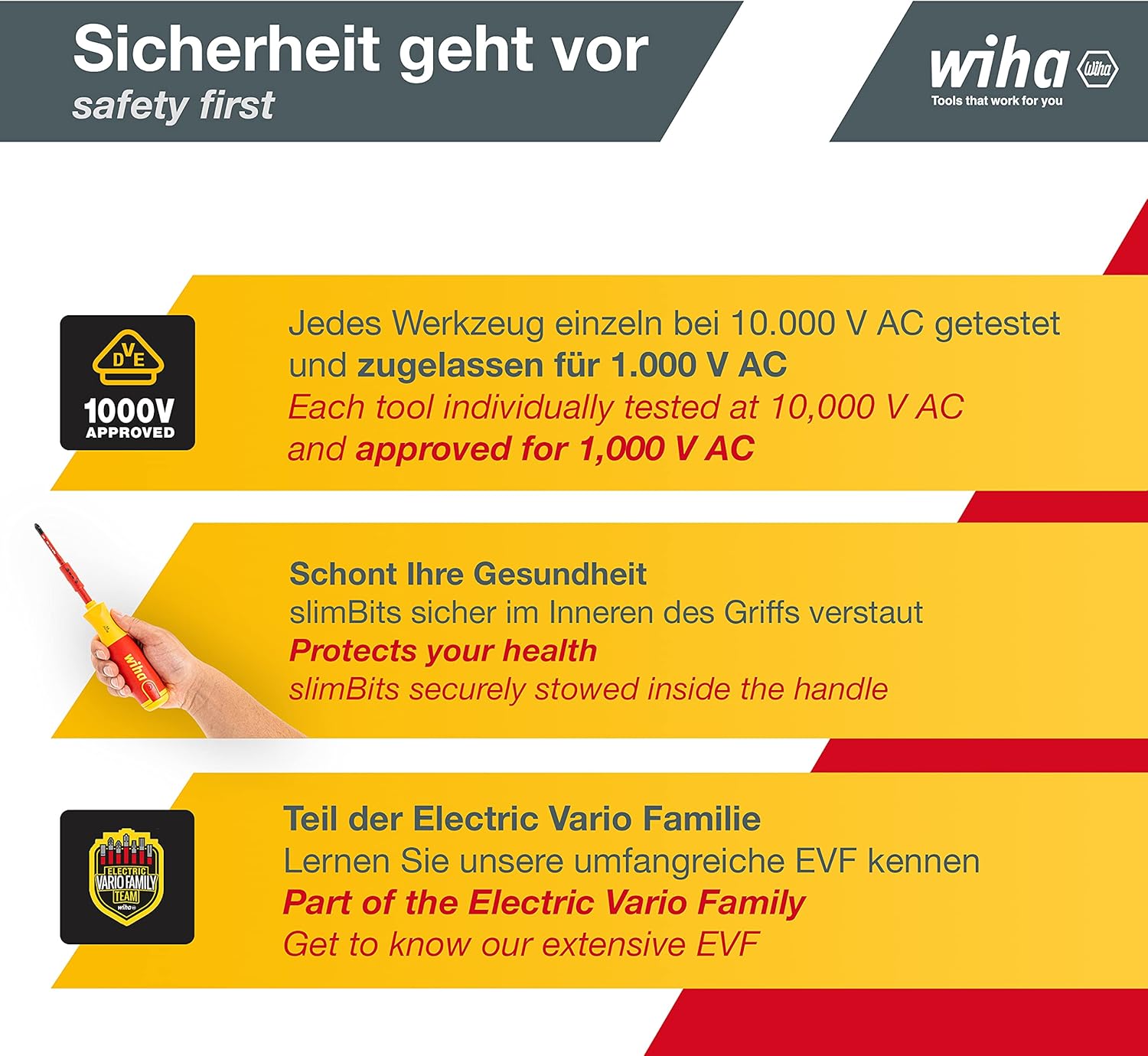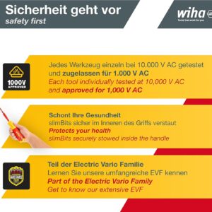 - Sicherheit bei Elektroarbeiten: Jedes einzelne Werkzeug aus dem Wiha Schraubendreher Set LiftUp electric ist bei 10.000 V AC getestet und für den Einsatz bis 1.000 V AC zugelassen.