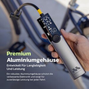 • PREMIUM-ALUMINIUMGEHÄUSE + VERBESSERTE PERFORMANCE – Das robuste Aluminiumgehäuse macht diese Fahrradpumpe langlebiger und hochwertiger als typische Kunststoff-Inflatoren. Verbesserte Mechanik, Motor und Elektronik sorgen für eine ultra-zuverlässige Leistung, auf die du dich verlassen kannst. Kompakt, aber „home-ready“: Als elektrische Fahrradpumpe passt sie bequem in Schublade, Bike-Schrank oder Kofferraum. Größe: 40×40×191 mm. Gewicht: 376gr