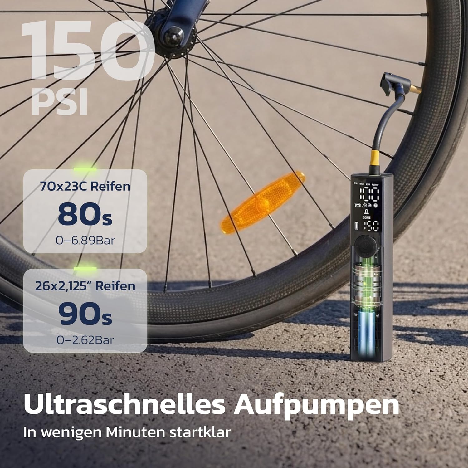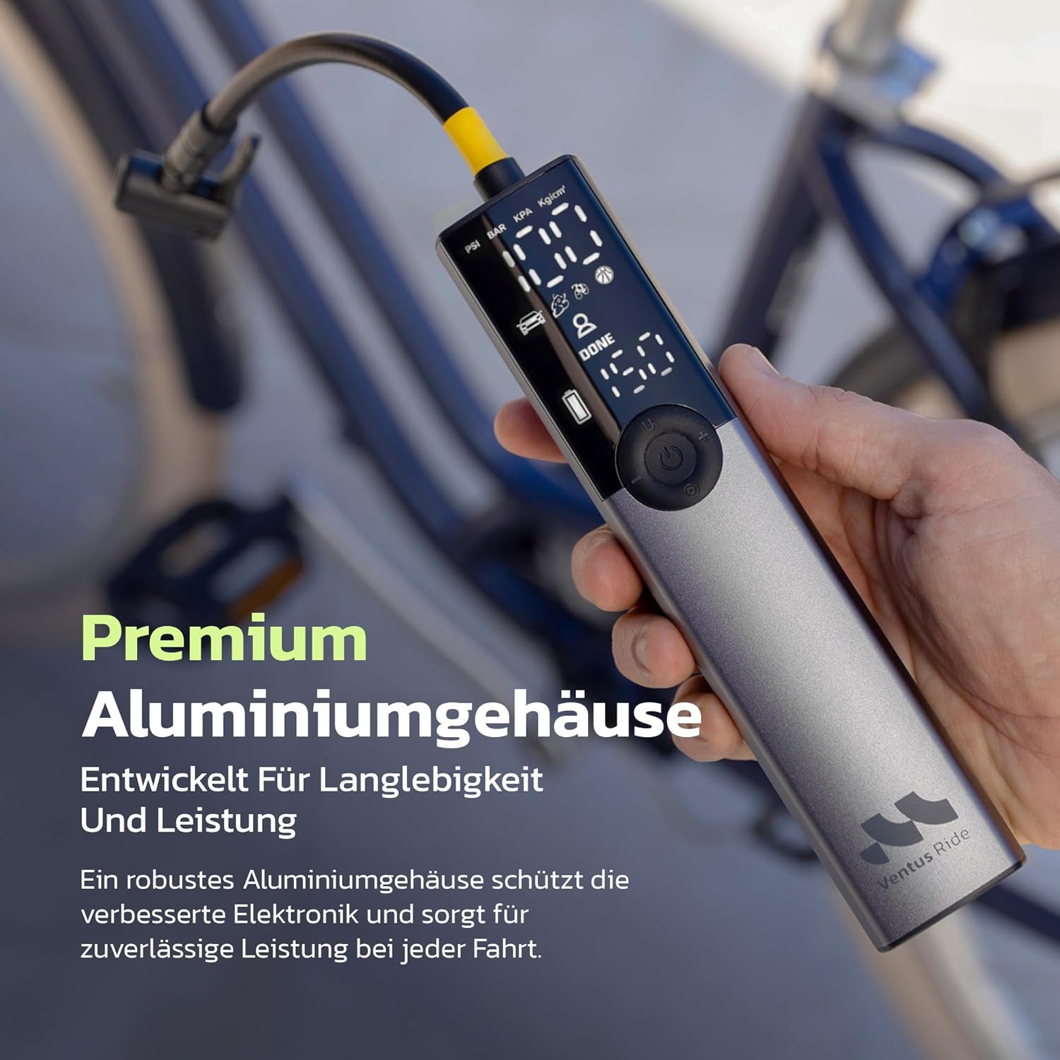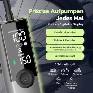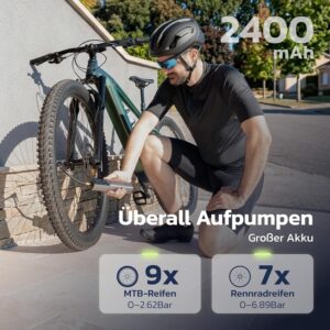 • SCHNELLES BIKE-AUFPUMPEN (150 PSI) – Ventus Ride ist eine kabellose elektrische Luftpumpe / tragbarer Reifenfüller mit 14-mm Hochleistungsmotor und 18 L/min Luftstrom – ideal für schnelle Top-ups bei Road, Gravel, MTB und E-Bike-Reifen. Mit bis zu 150 PSI / 10,3 Bar meistert sie auch hohe Drücke, wenn du sie brauchst. Diese Luftpumpe Fahrrad kann 7 Standard-700×23C-Fahrradreifen von 0–100 PSI (0–6,9 bar) in jeweils etwa 2 Minuten aufpumpen.