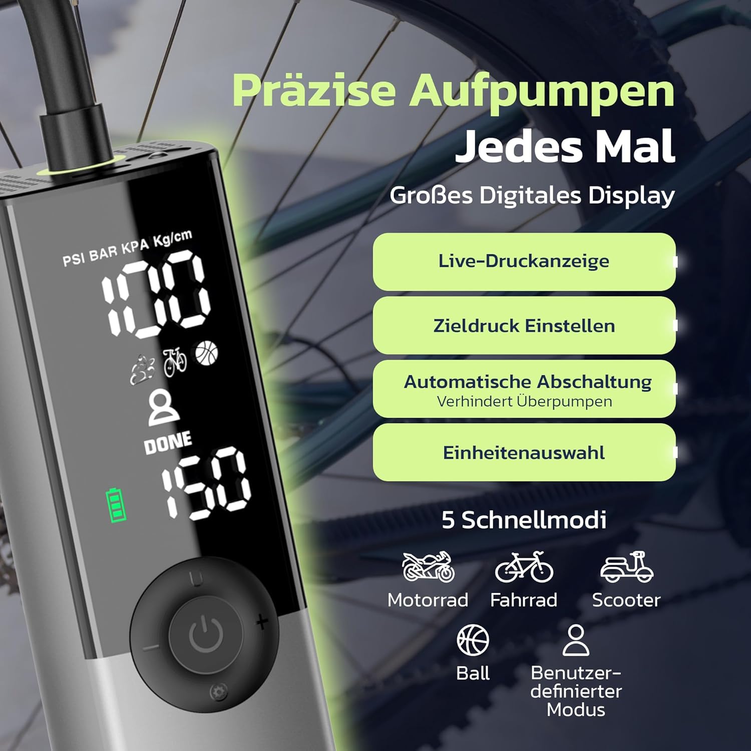 Woowind Ventus Ride Fahrradpumpe, 150 PSI/10,3 Bar, Elektrische Luftpumpe, Aufpumpen in 1 Minute, Akku Kompressor mit Presta-, Schrader-, Dunlop-Ventil für Rennrad, Mountainbike & E-Bike, Auto-Stopp