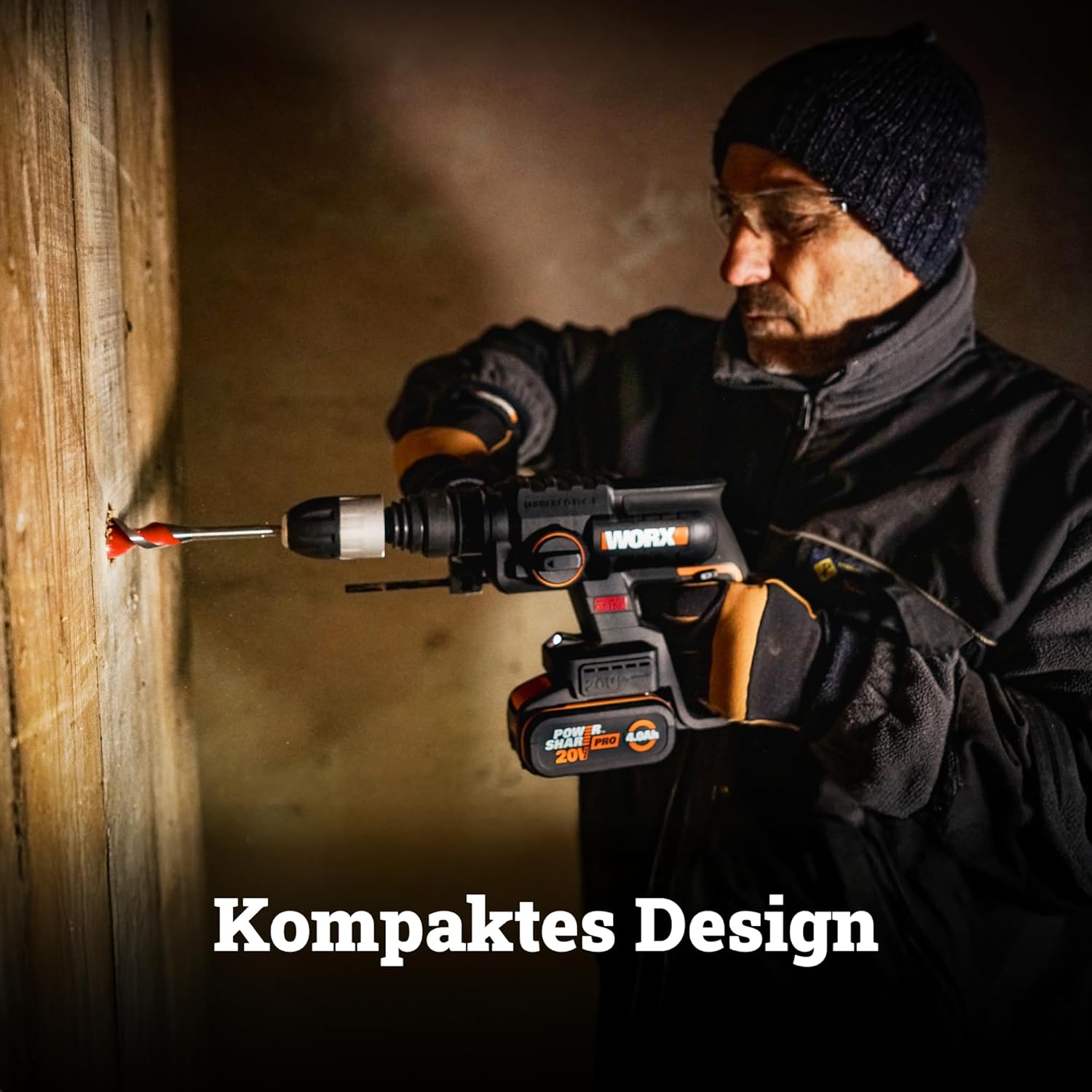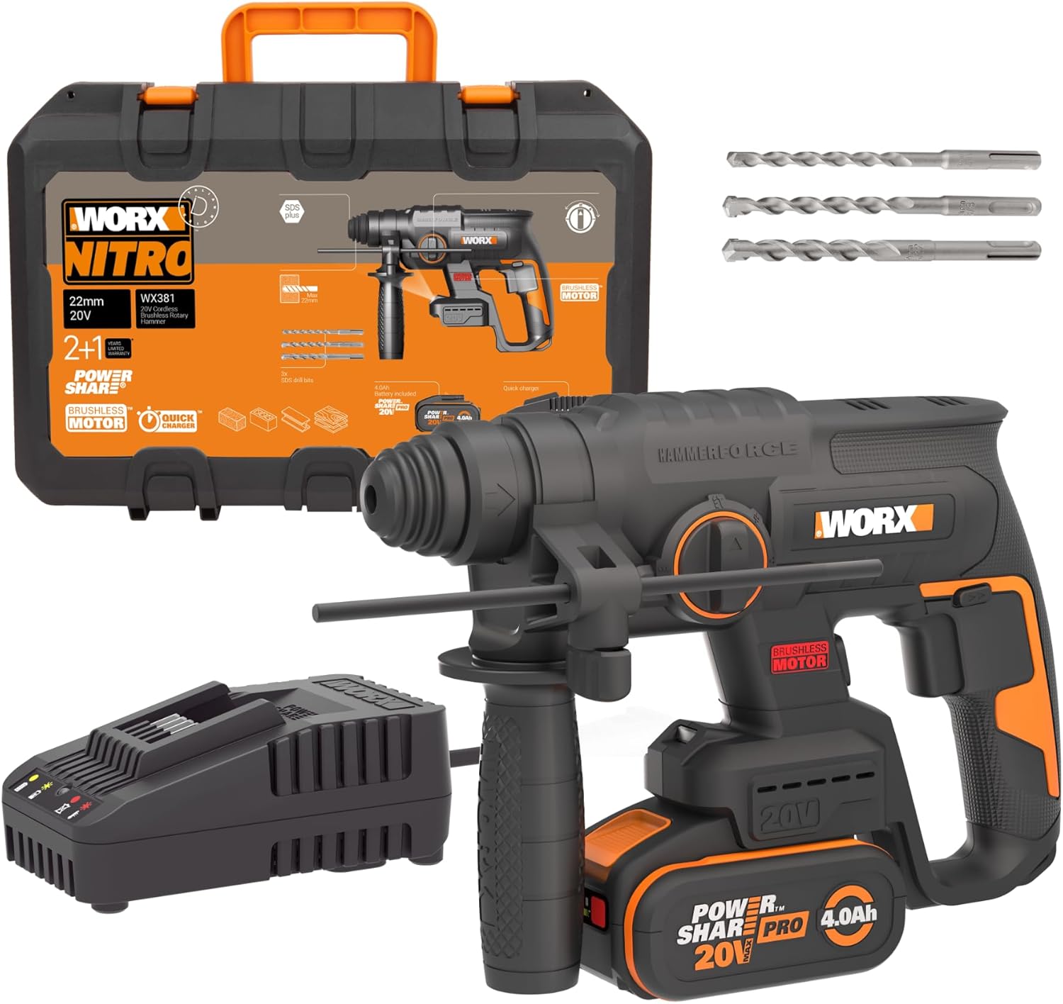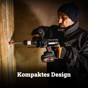 Der WORX NITRO WX381 Akku Bohrhammer richtet sich an ambitionierte Heimwerker und Handwerker, die ein kompaktes 3-in-1-Werkzeug für Bohr-, Hammerbohren- und Meißelarbeiten suchen. Mit 2,0 Joule Schlagenergie, bürstenlosem Motor und 20V 4Ah Akku meistert dieser Bohrhammer Arbeiten in Beton, Mauerwerk, Holz und Stahl. Dank PowerShare-System lässt sich der Akku mit allen WORX 20V-Geräten nutzen – ideal für alle, die bereits WORX-Werkzeuge besitzen oder ein flexibles Akku-System aufbauen möchten.