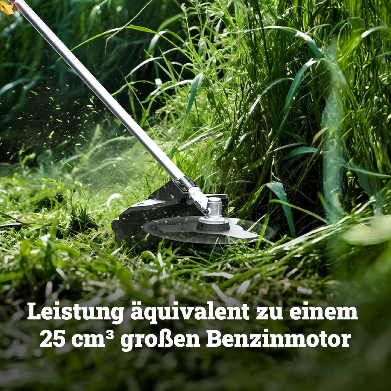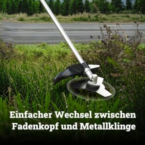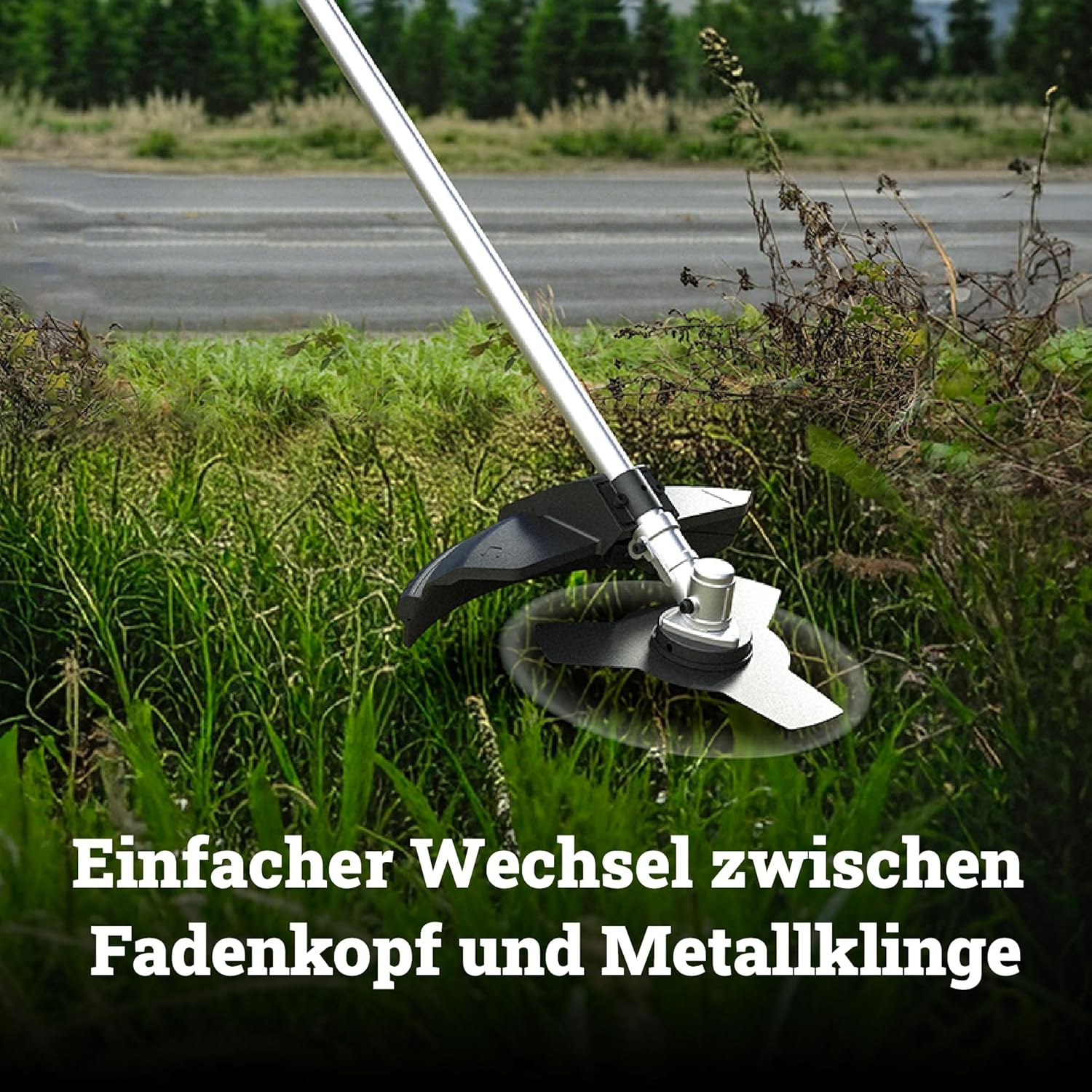• Zwei Schneidsysteme in einem Gerät: Wechsel zwischen Fadenkopf (38 cm) für Rasenkanten und Metallklinge (25,5 cm) für dichtes Gestrüpp – spart den Kauf eines zweiten Geräts