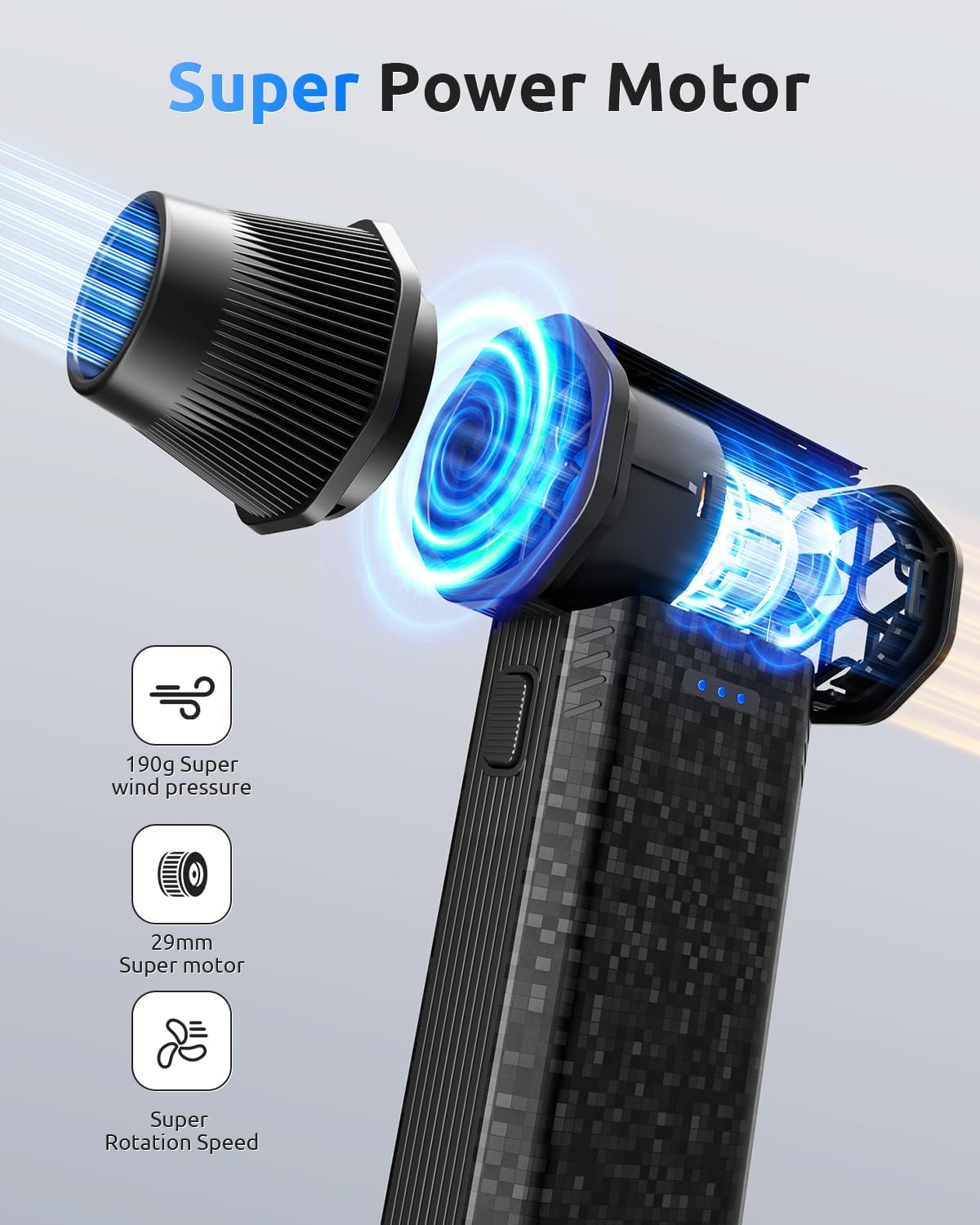 • 【3 Geschwindigkeiten und intelligente Temperaturkontrolle】 Wählen Sie zwischen 25.000 / 60.000 / 110.000 U/min, um jede Art von Reinigung zu bewältigen, von der schonenden Reinigung elektronischer Geräte bis hin zu kraftvollen Luftstrahlen zur Entfernung hartnäckiger Verschmutzungen. Das NTC-System und der 15A-Schutz verhindern das Überhitzen und verlängern die Lebensdauer des Motors auf bis zu 5.000 Betriebsstunden.