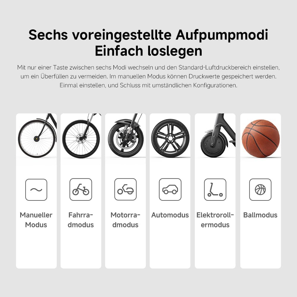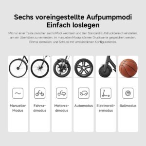 Der Kompressor verfügt über sechs voreingestellte Aufpumpmodi, zwischen denen Sie mit nur einer Taste wechseln können. Diese Modi helfen, ein Überfüllen zu vermeiden, indem sie Standard-Luftdruckbereiche für verschiedene Anwendungen vorgeben. Im manuellen Modus können Sie individuelle Druckwerte speichern und müssen diese nicht jedes Mal neu konfigurieren.