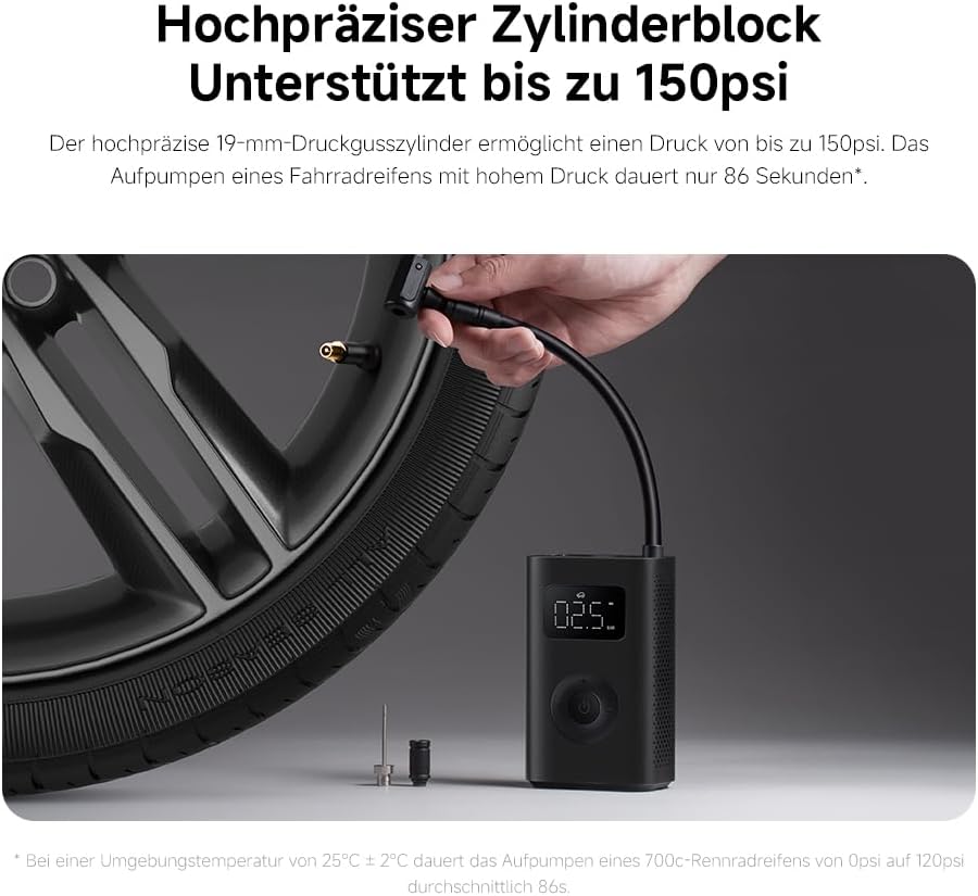 Das Gerät erreicht einen maximalen Druck von bis zu 150 PSI. Der hochpräzise 19-mm-Druckgusszylinder ermöglicht diese hohe Druckleistung, wodurch selbst ein Fahrradreifen mit hohem Druck in nur 86 Sekunden aufgepumpt werden kann.